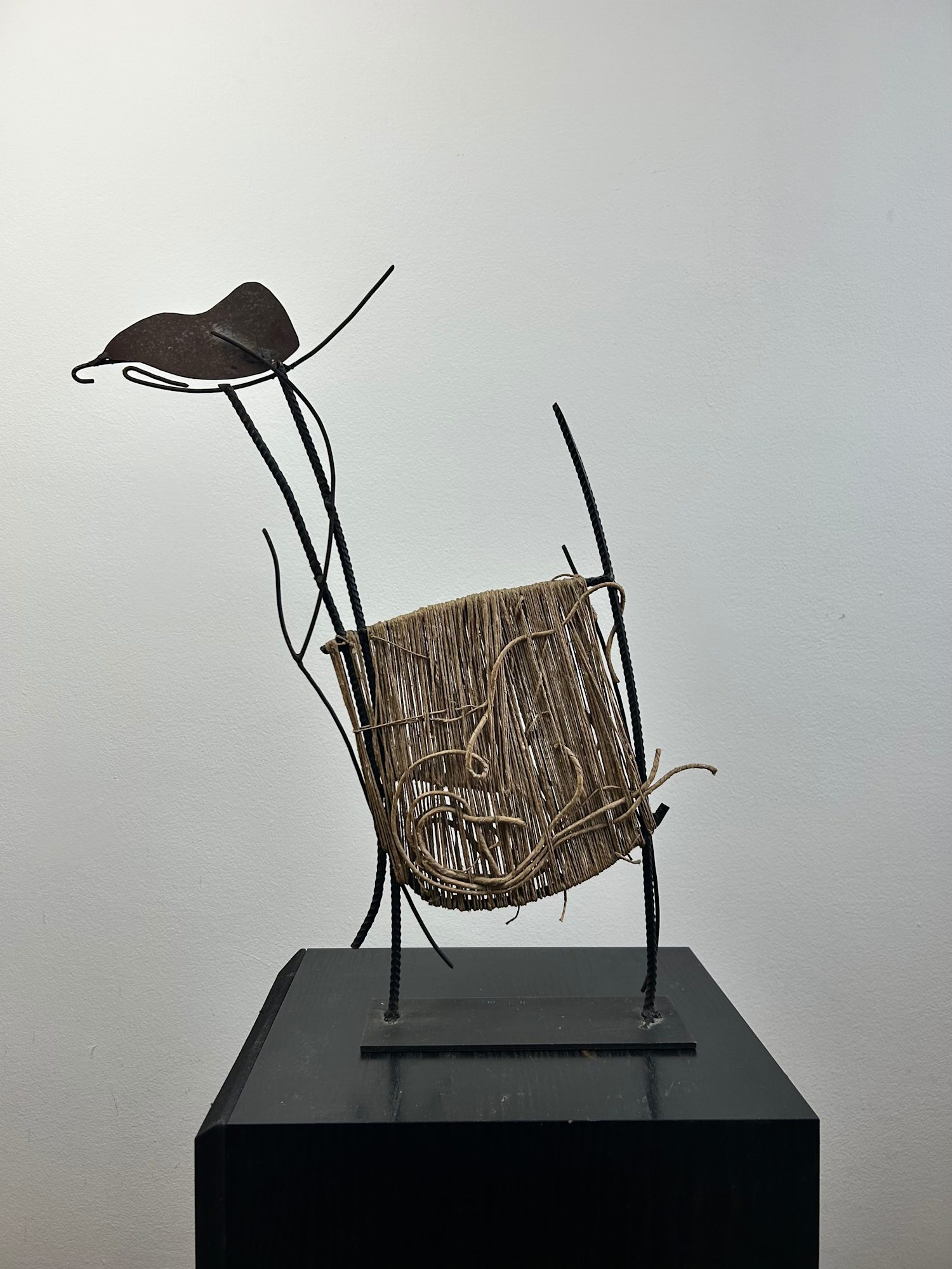 In this delicate and poetic sculpture, Ruggero Gamberini combines raw iron rods, a curved metal form, and hand-wound twine to create an organic tension between strength and fragility. The piece suggests both botanical and anatomical associations, with the textured spago (string) evoking nests, fibres, or vessels. Its asymmetrical poise lends a sense of gentle movement, as though swaying in a silent current.