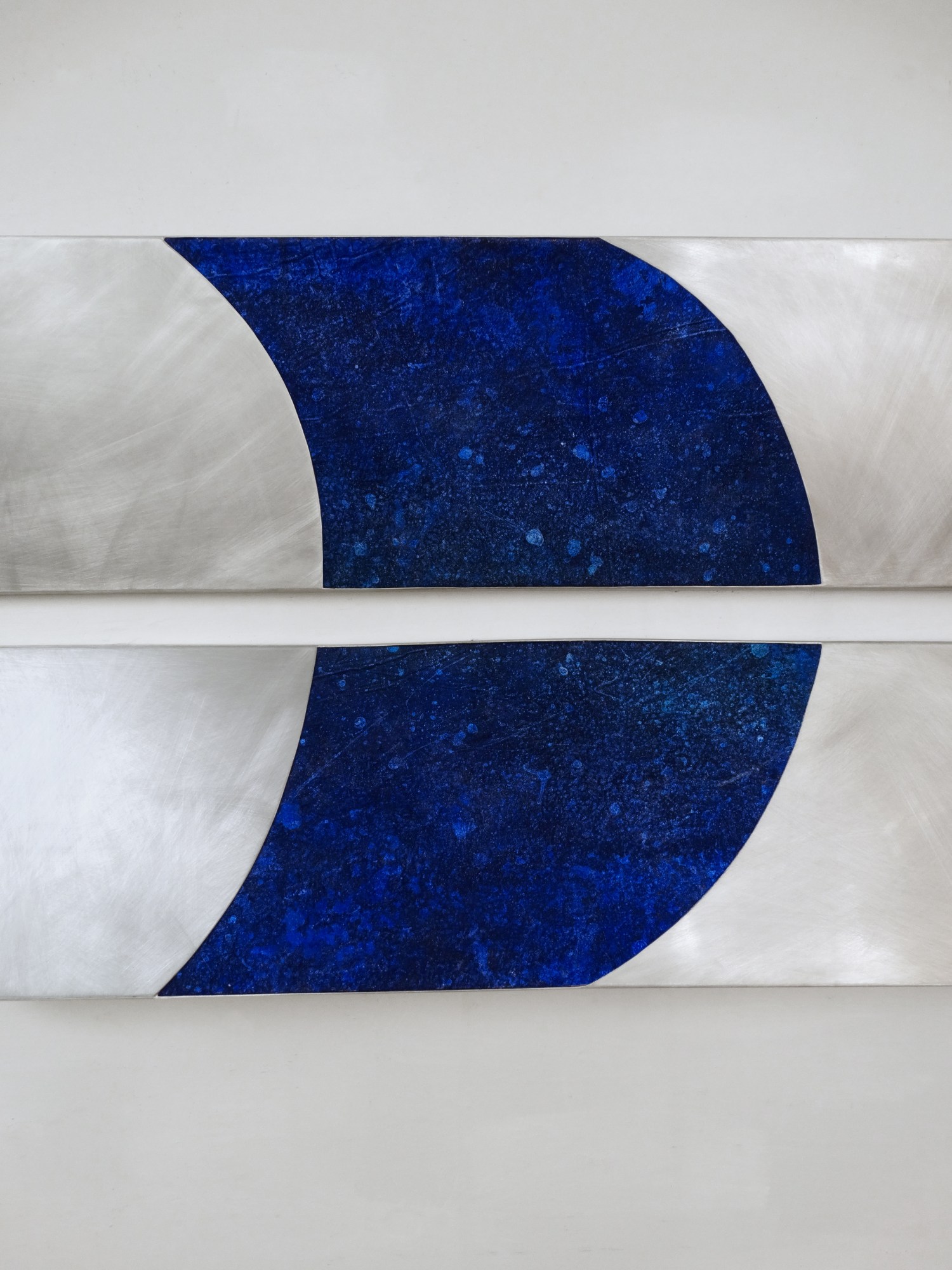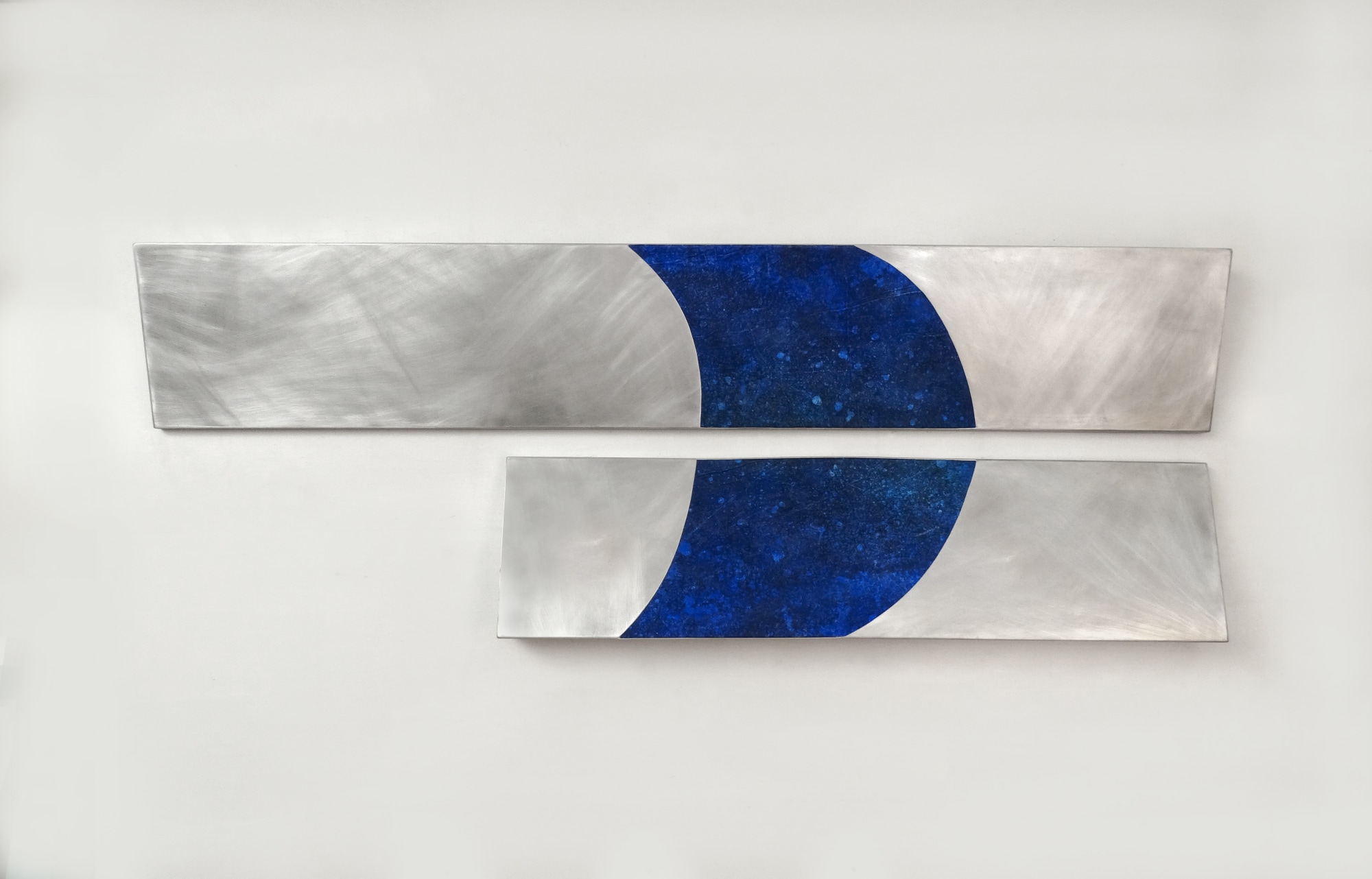 Exploring curves within rigid metal box construction was a natural step for us. Softening, feminizing the metal, the arcs reference aspects of geometry and balance while playing a foil to the angularity and slope of the metal construction. The paintings seen through cutouts in the metal and multihued, multilayered oil on canvas. The closer the viewer gets, the more they see.