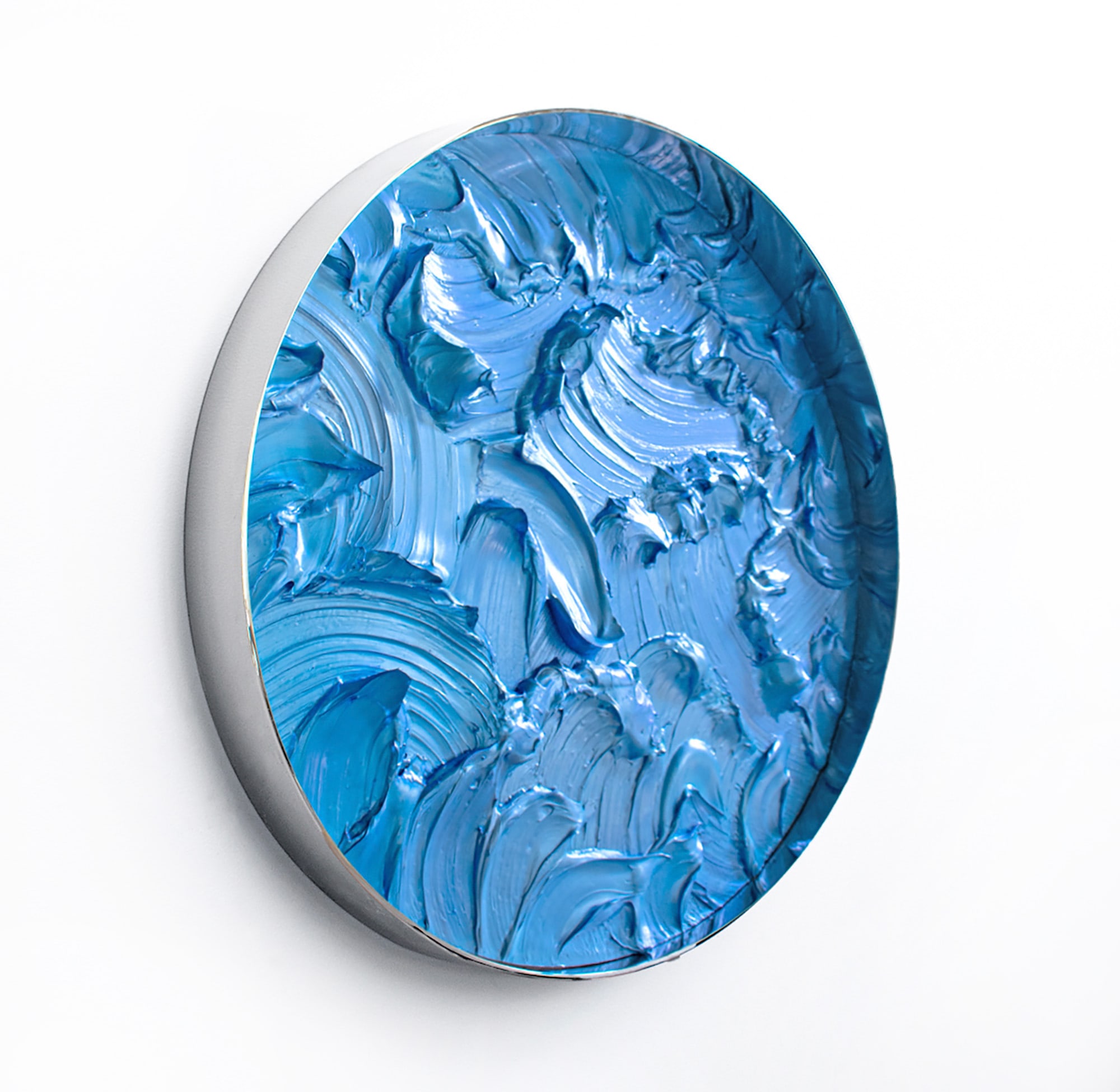 mirror polished stainless steel with pearlescent enamel and mixed media
