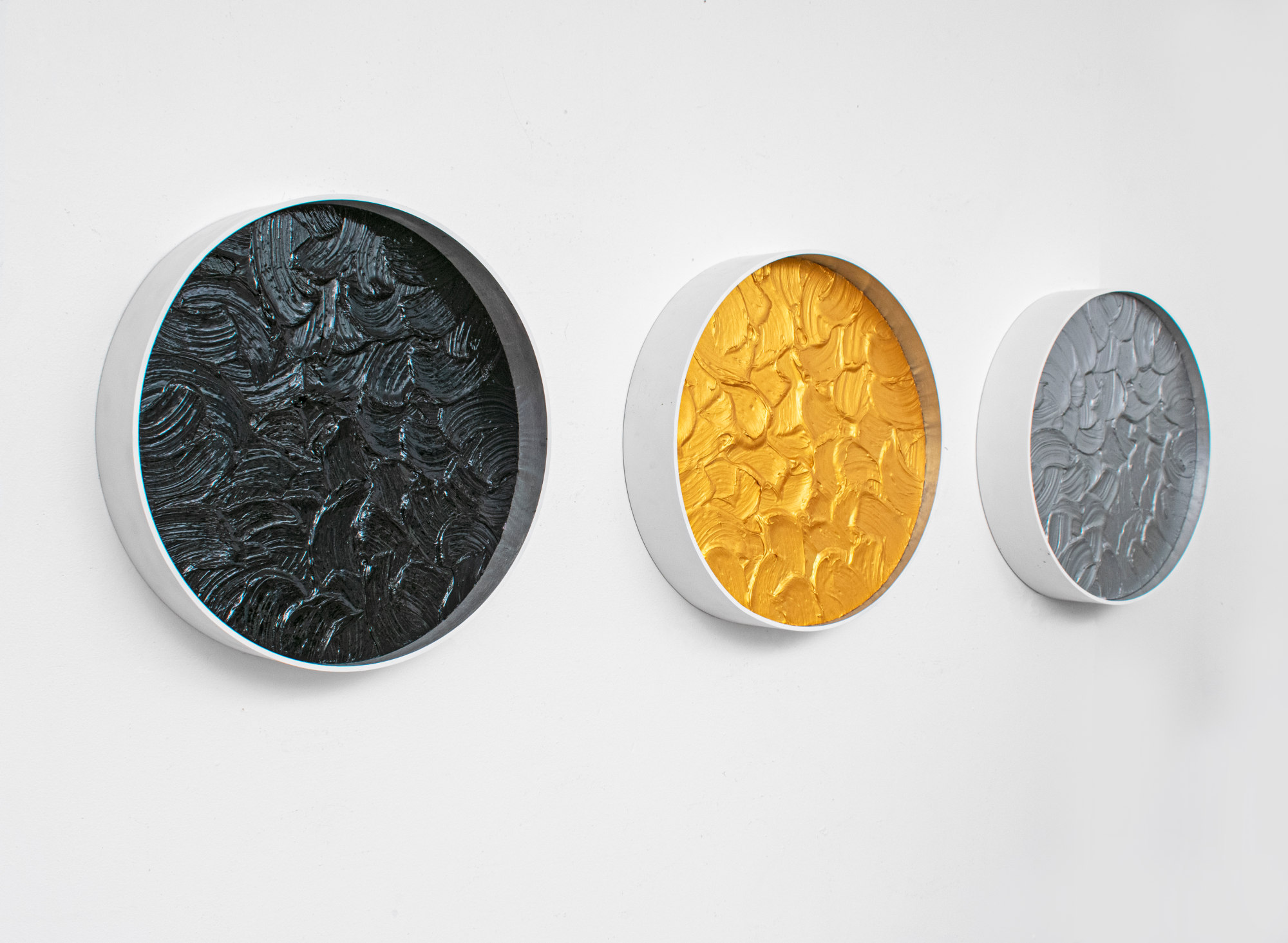 Crucible is part of our Wave Series involving gestural painting with shiny enamel, encased in metal. The gestural marks are a nod to some of our favorite historical painters, as well as referencing water patterns. This specific piece plays with metallics and black, and the essences of metals when melted and fluid oil.
