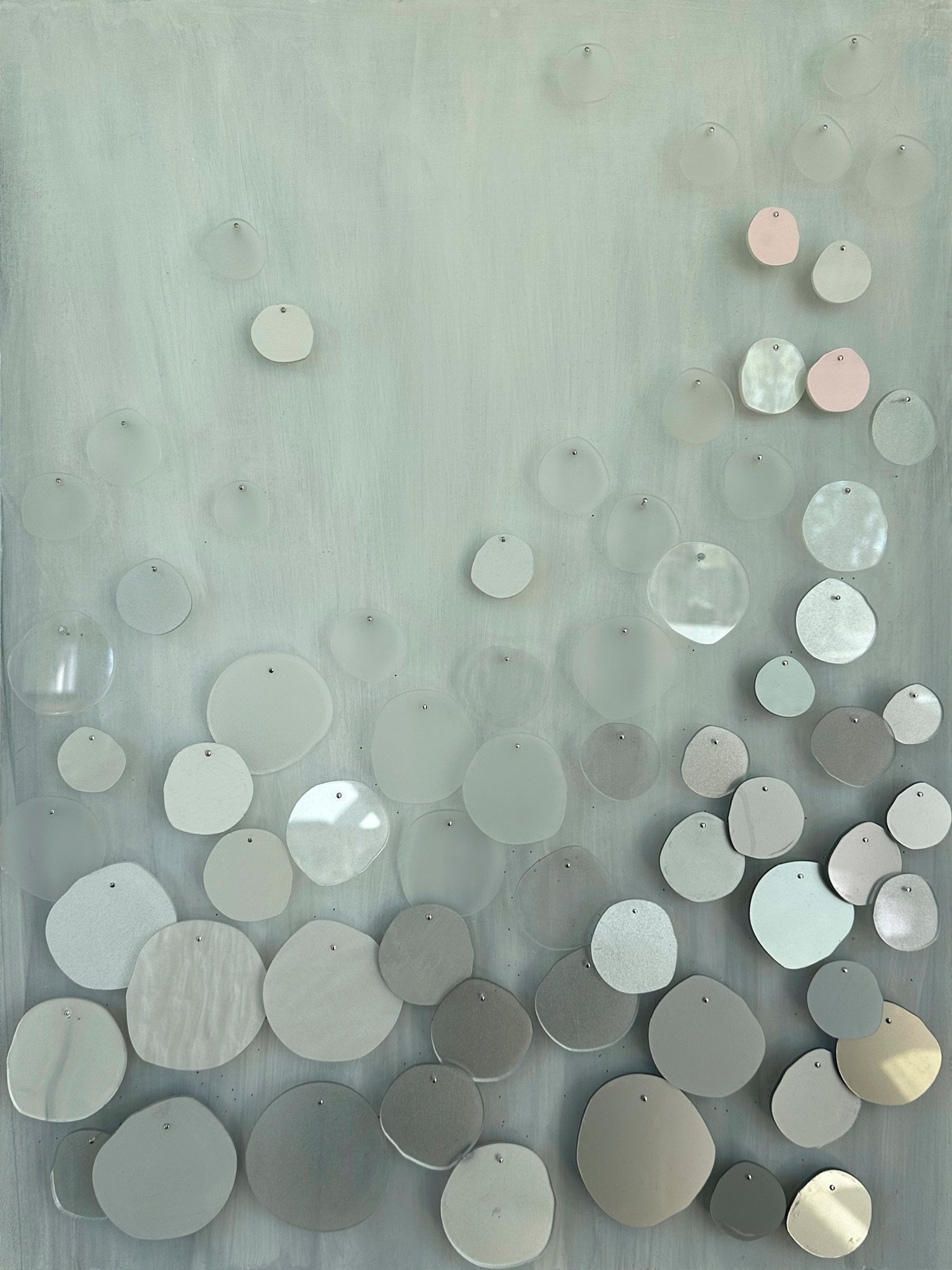A constellation of painted plexiglass and wood discs in pale gray, blush, soft pewter, and ivory drifts upward through a gentle field of layered light. Glossy and matte finishes alternate across the surface, catching and diffusing illumination. Each shape is mounted with stainless steel pins to a painted wood and veneer-faced foam panel, hovering just above the surface to cast delicate shadows. A quiet sense of continuity unfolds across the piece—soft as memory, steady as breath