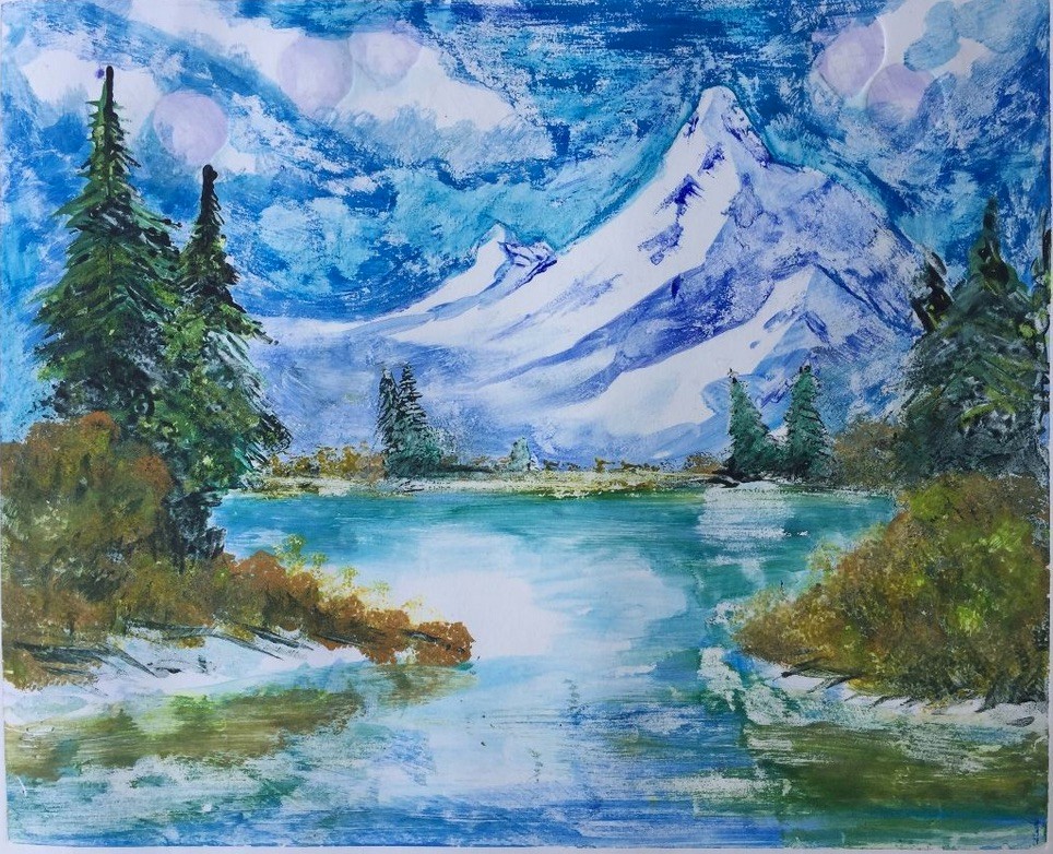 Solarplate etched heads of Bob Ross in the clouds overprinted with watercolor monotype.