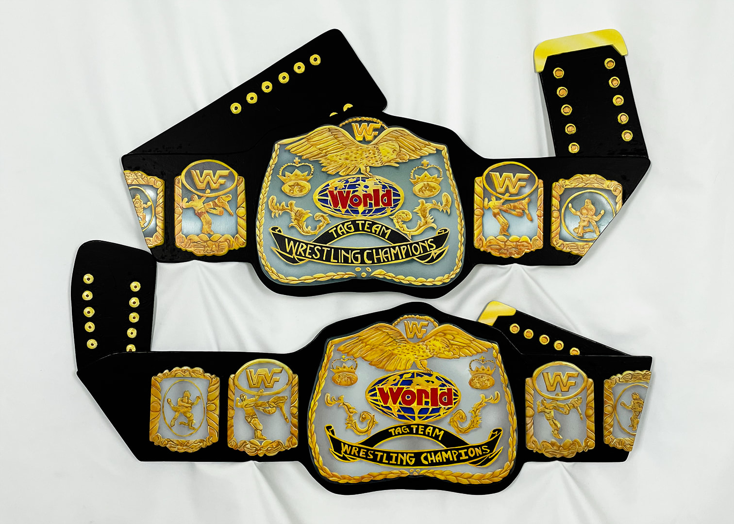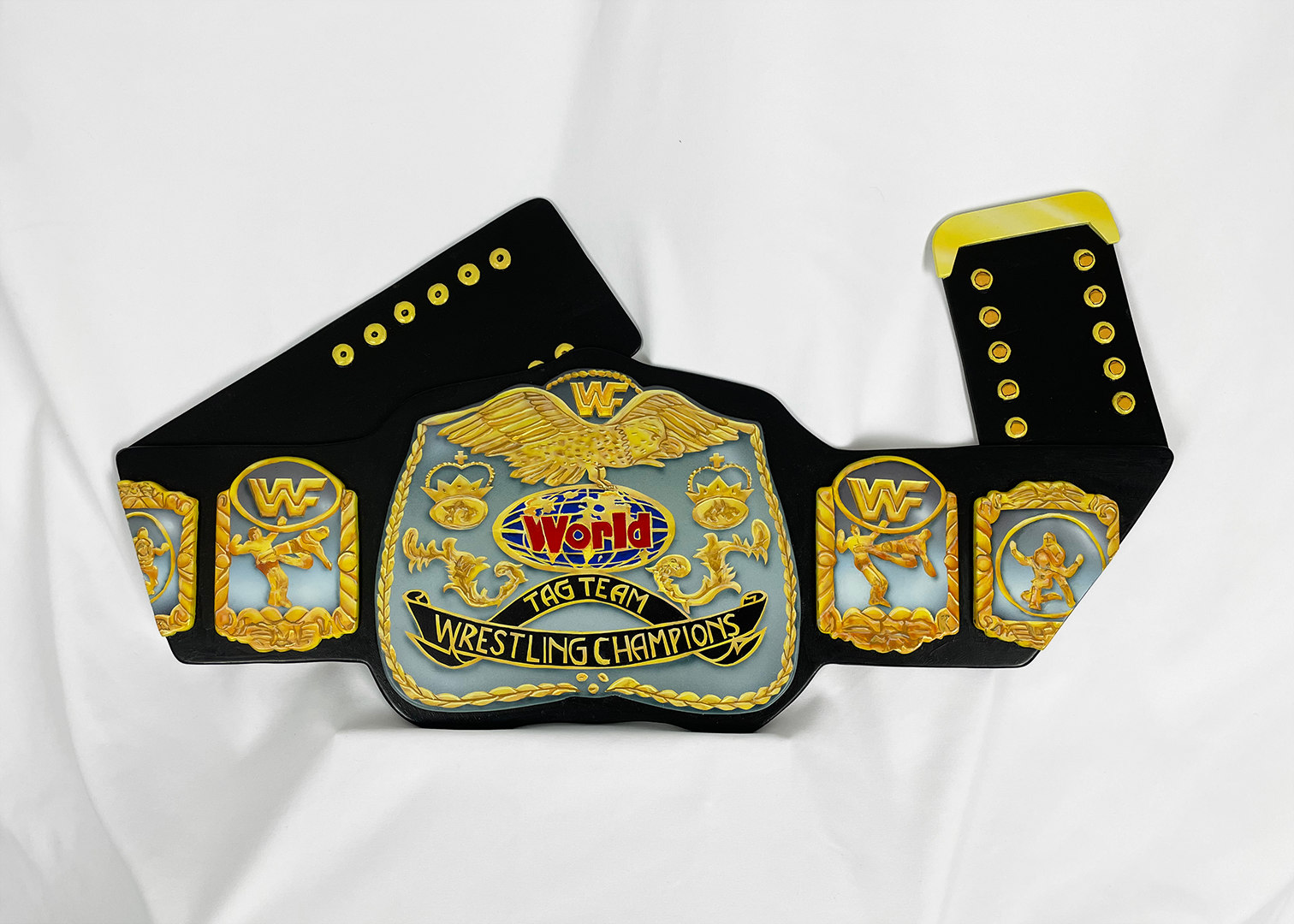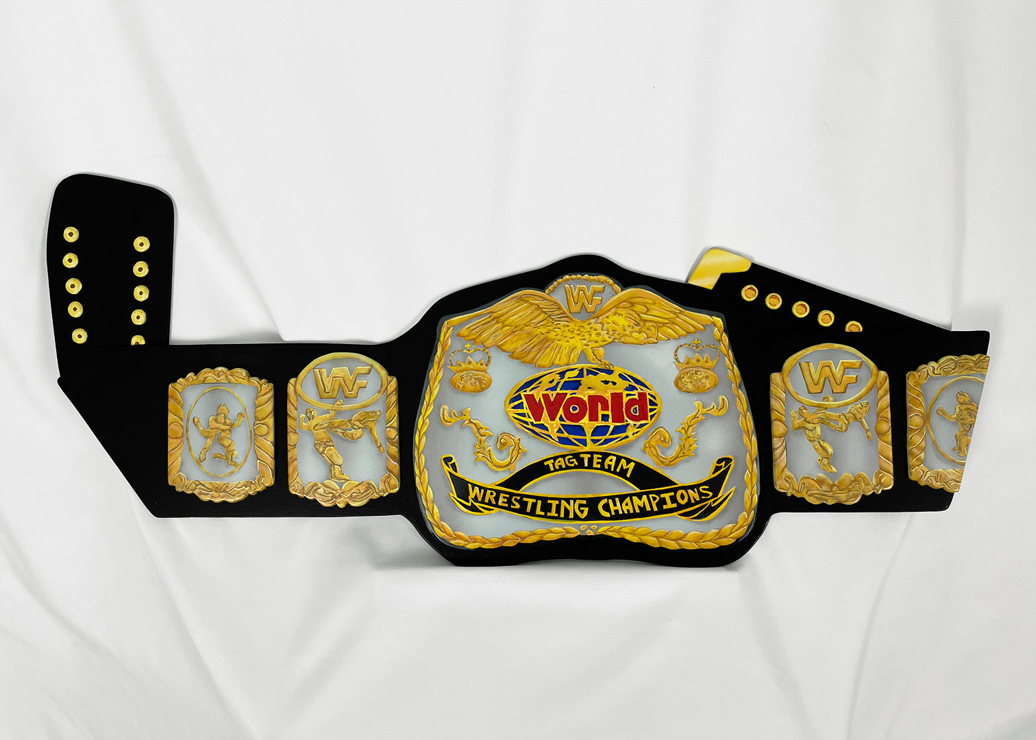 This sculpture is inspired by the Tag Team Championship titles used by the WWF from 1985 through 2004. The belt design, originally created by Reggie Parks, is one of the most recognizable in wrestling history and the titles were worn by such legendary tag teams as Demolition, The Hart Foundation, The Rockers, and New Age Outlaws. Demolition held the titles for a record 478 days during their first reign.