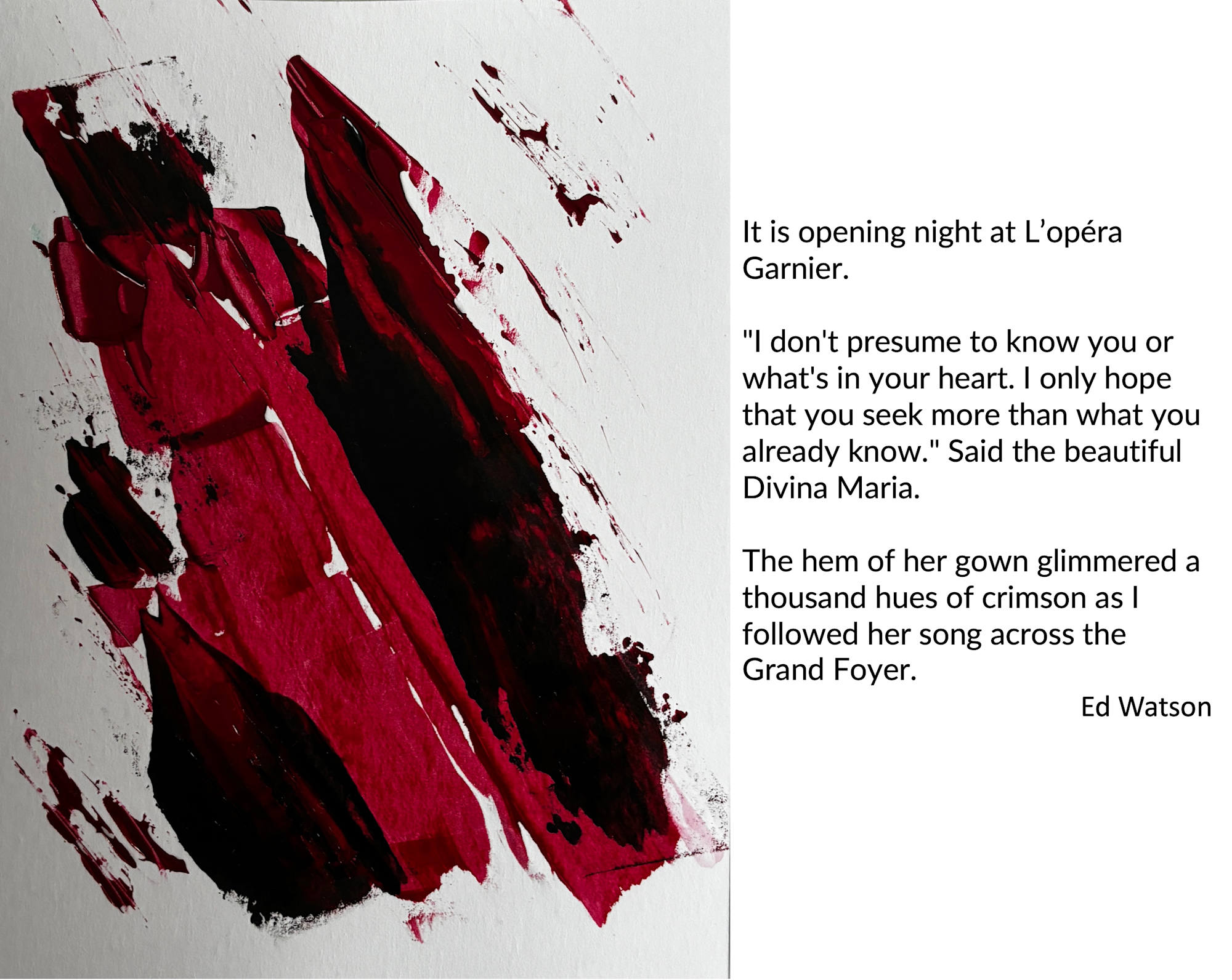 The hem of her gown glimmered a thousand hues of crimson as I followed her song across the Grand Foyer.