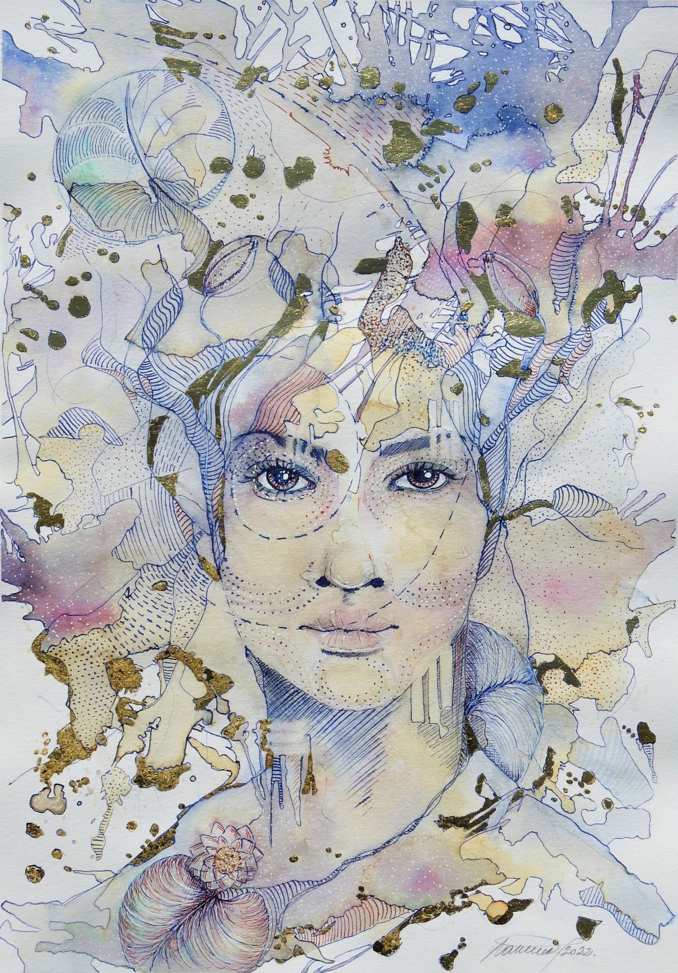 "Dynamic Nature " is painting of a realistic female portrait connected with nature, painted with ink, tea, red wine and gold leafs. It was created in 7 different layers, with 7 different materials, to get 7 different faces of the same woman.