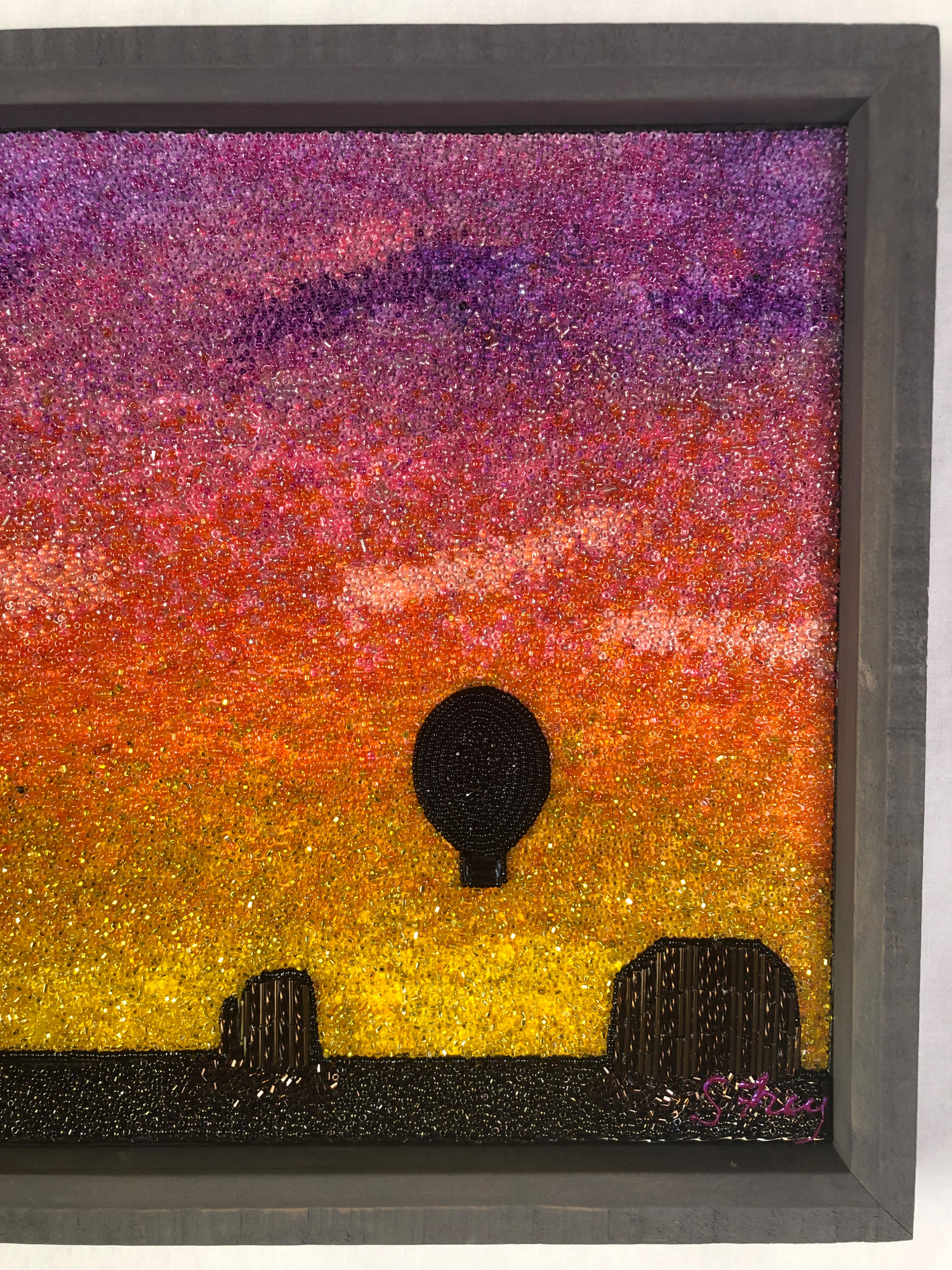 Desert landscape with hot air balloon coasting through a huge colorful sky.