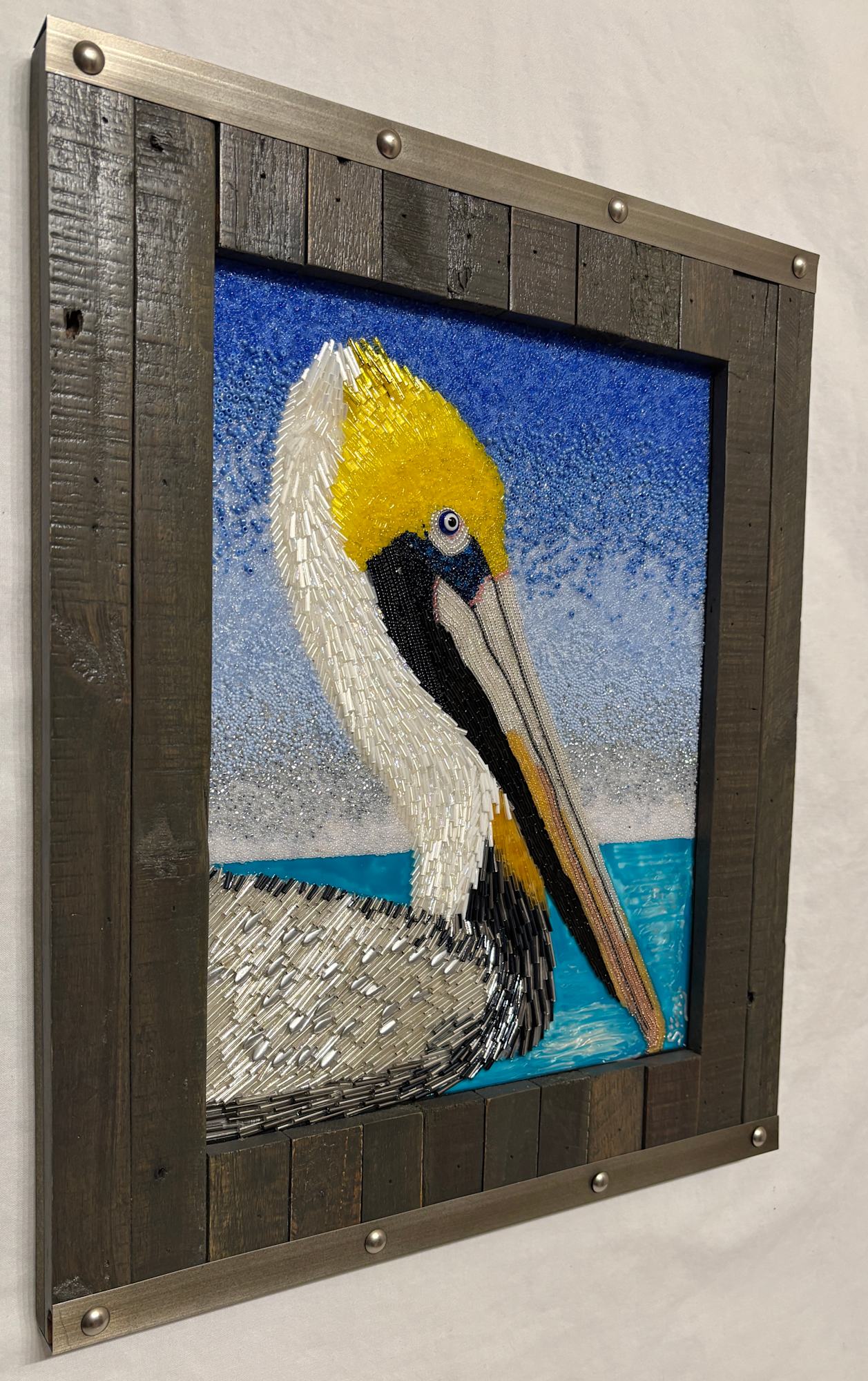 Jeffery is a proud pelican relaxing in the water. His body is made of seed and bugle beads and the water is stained glass paint to give it a unique texture and reflection.