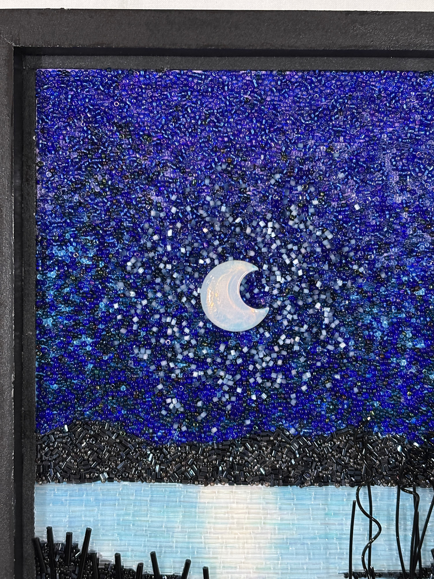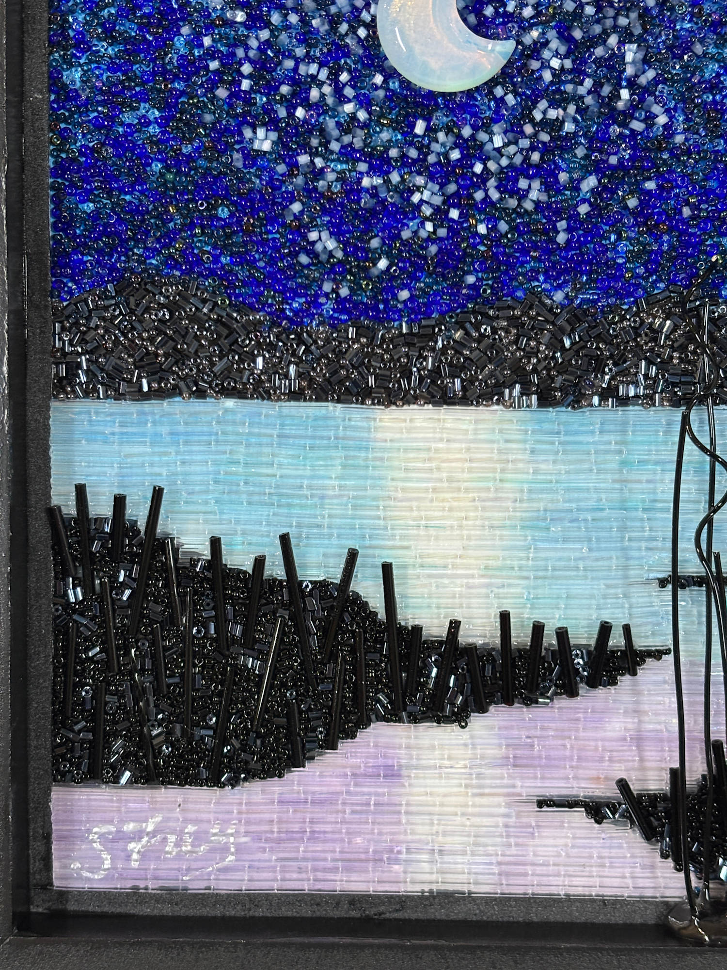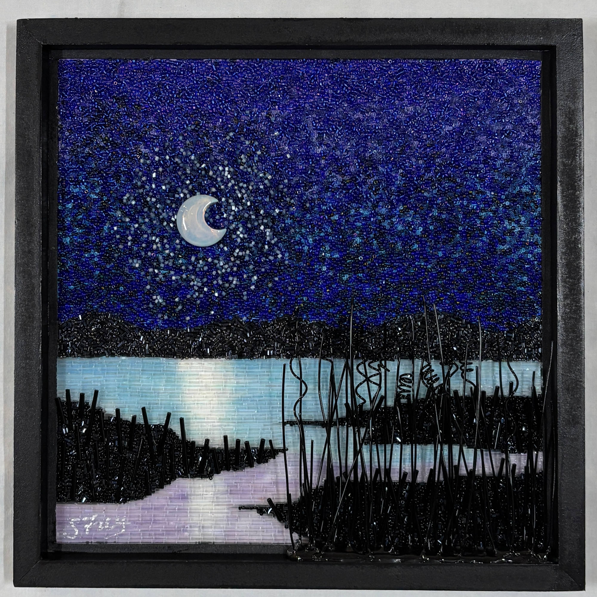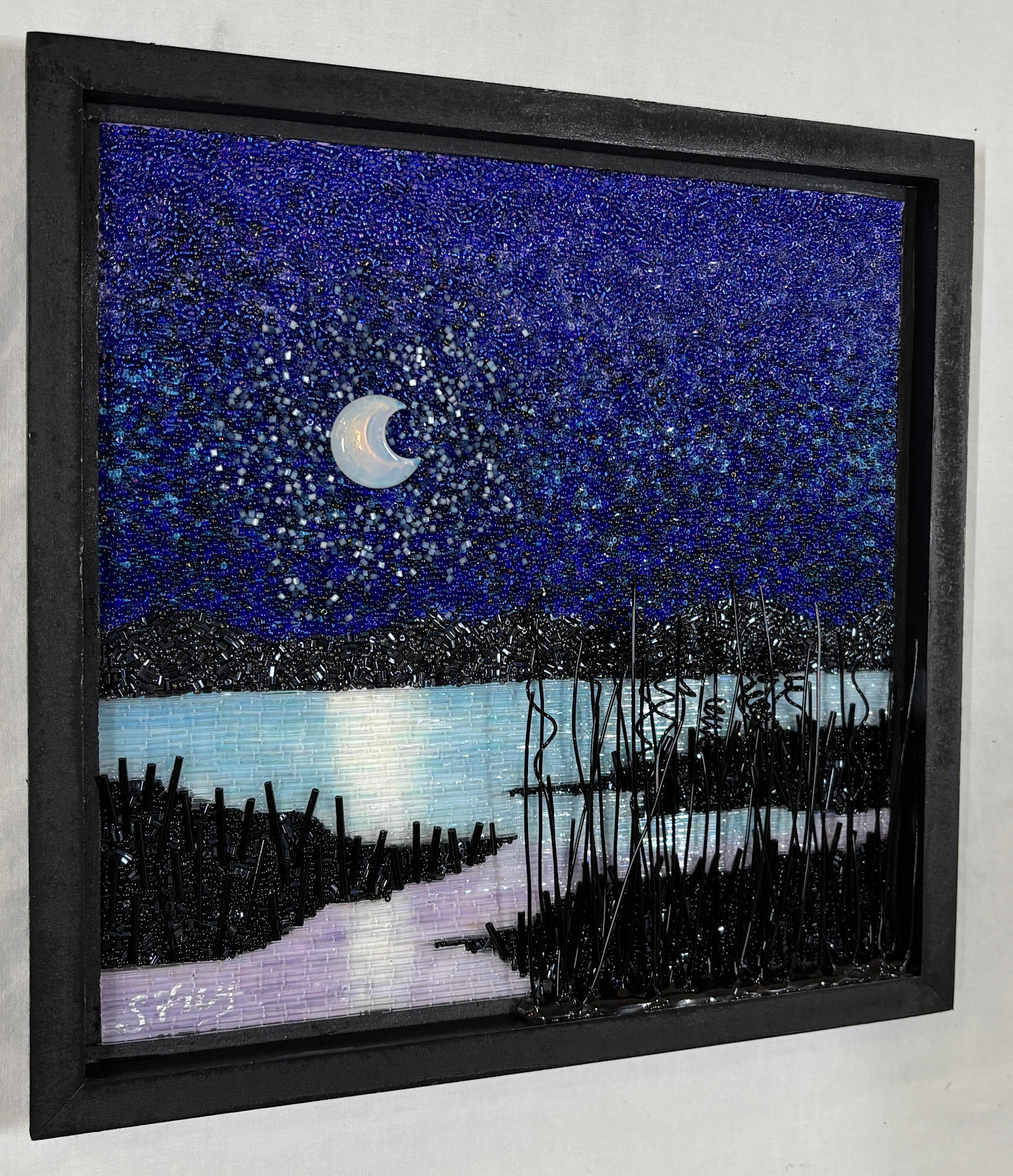 Moonlit Bayou invites you into a serene night by the water, where every glass bead catches the glow of a radiant moon. This mosaic weaves shimmering reflections across a still bayou, framed by the delicate silhouettes of marsh reeds swaying in the quiet dark. The sparkle of beads and the subtle structure of wire bring this tranquil scene to life, capturing the magic and mystery of a moonlit escape.