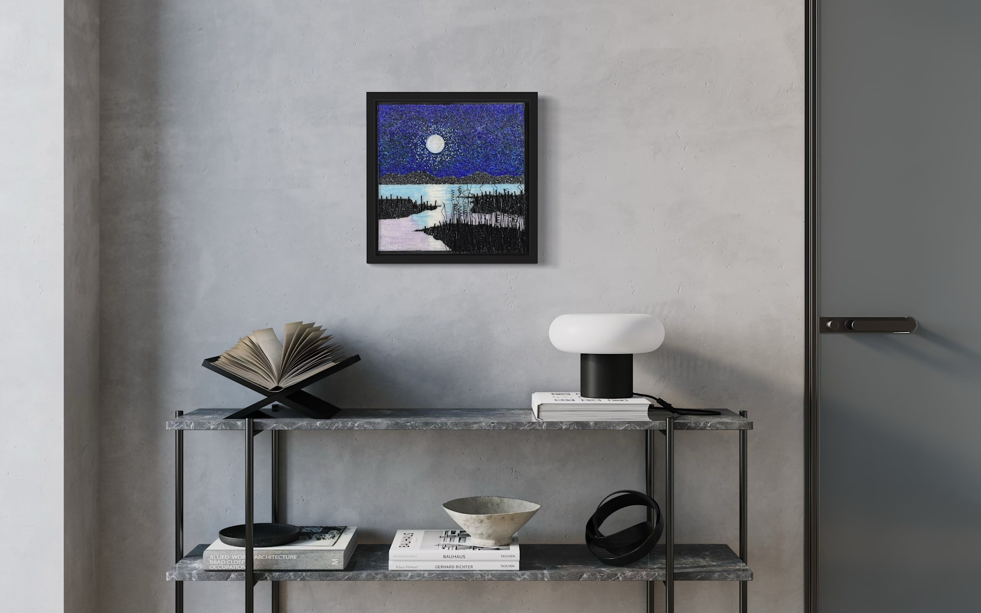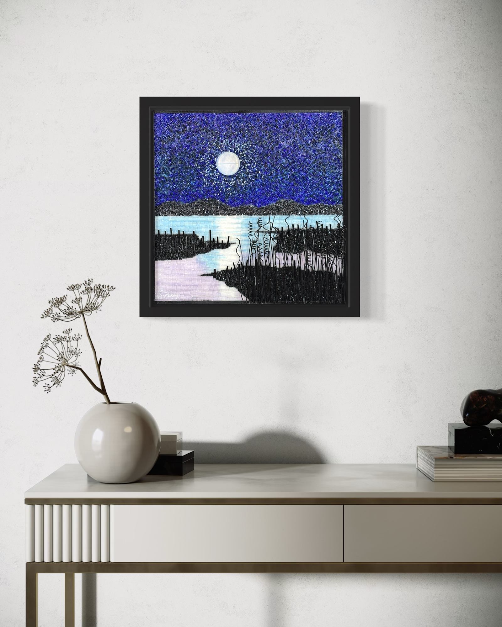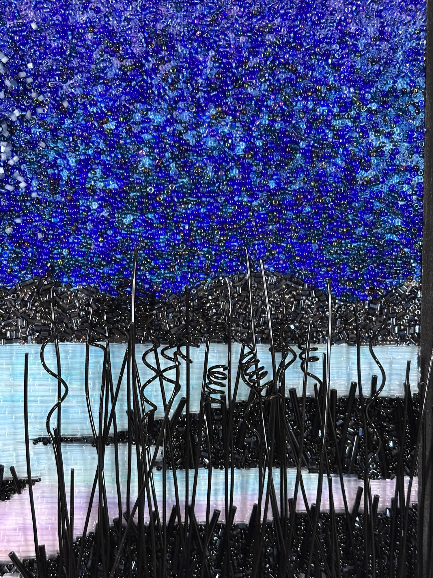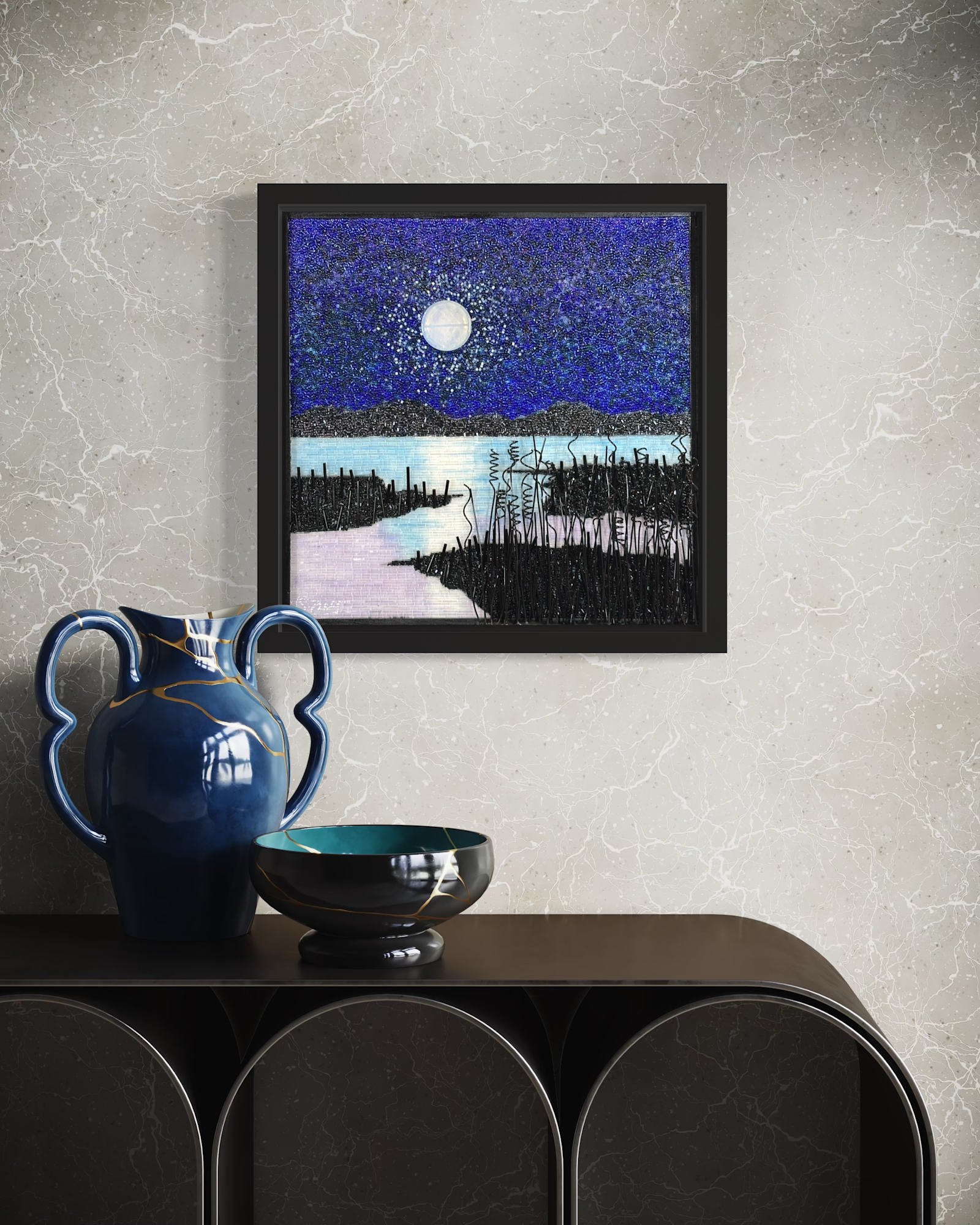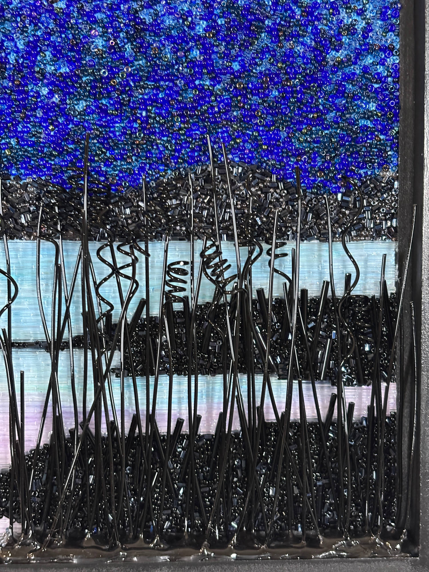 Moonlit Bayou invites you into a serene night by the water, where every glass bead catches the glow of a radiant moon. This mosaic weaves shimmering reflections across a still bayou, framed by the delicate silhouettes of marsh reeds swaying in the quiet dark. The sparkle of beads and the subtle structure of wire bring this tranquil scene to life, capturing the magic and mystery of a moonlit escape.