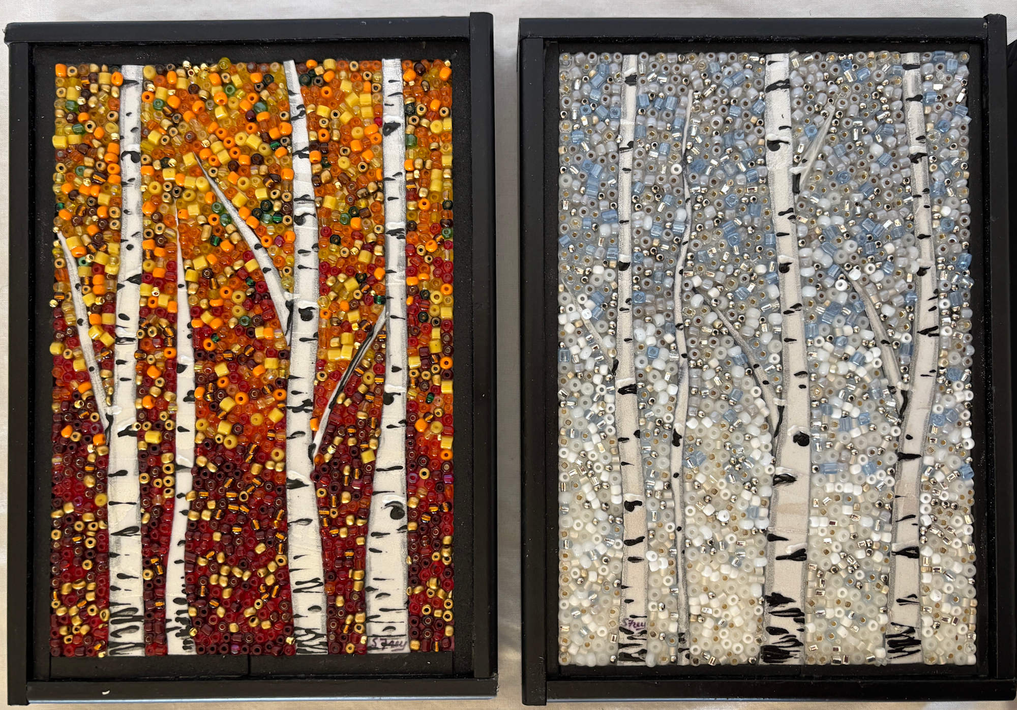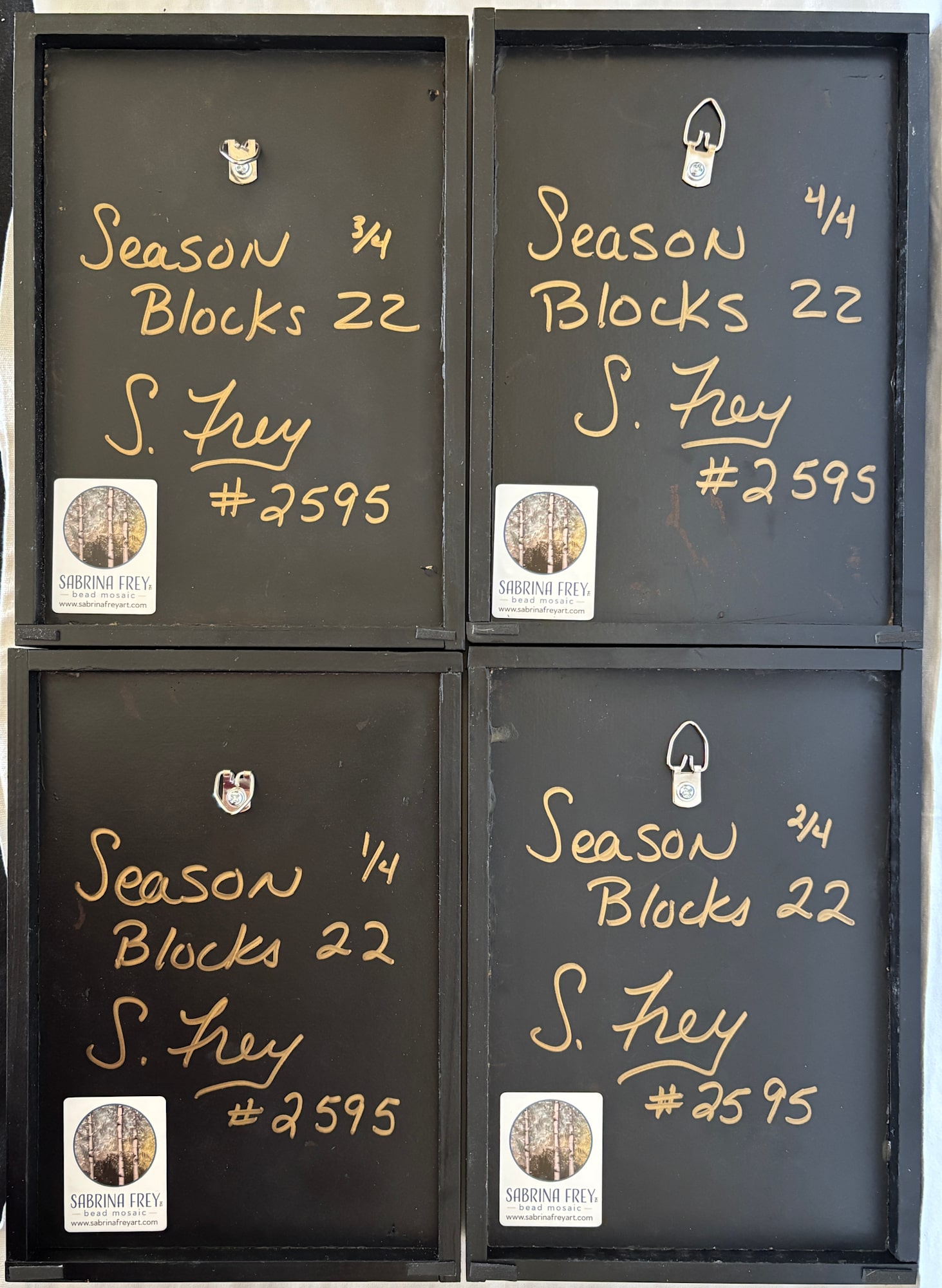 Set of four 9x6x2 blocks each with a tree scene in one of the four seasons framed in Black.