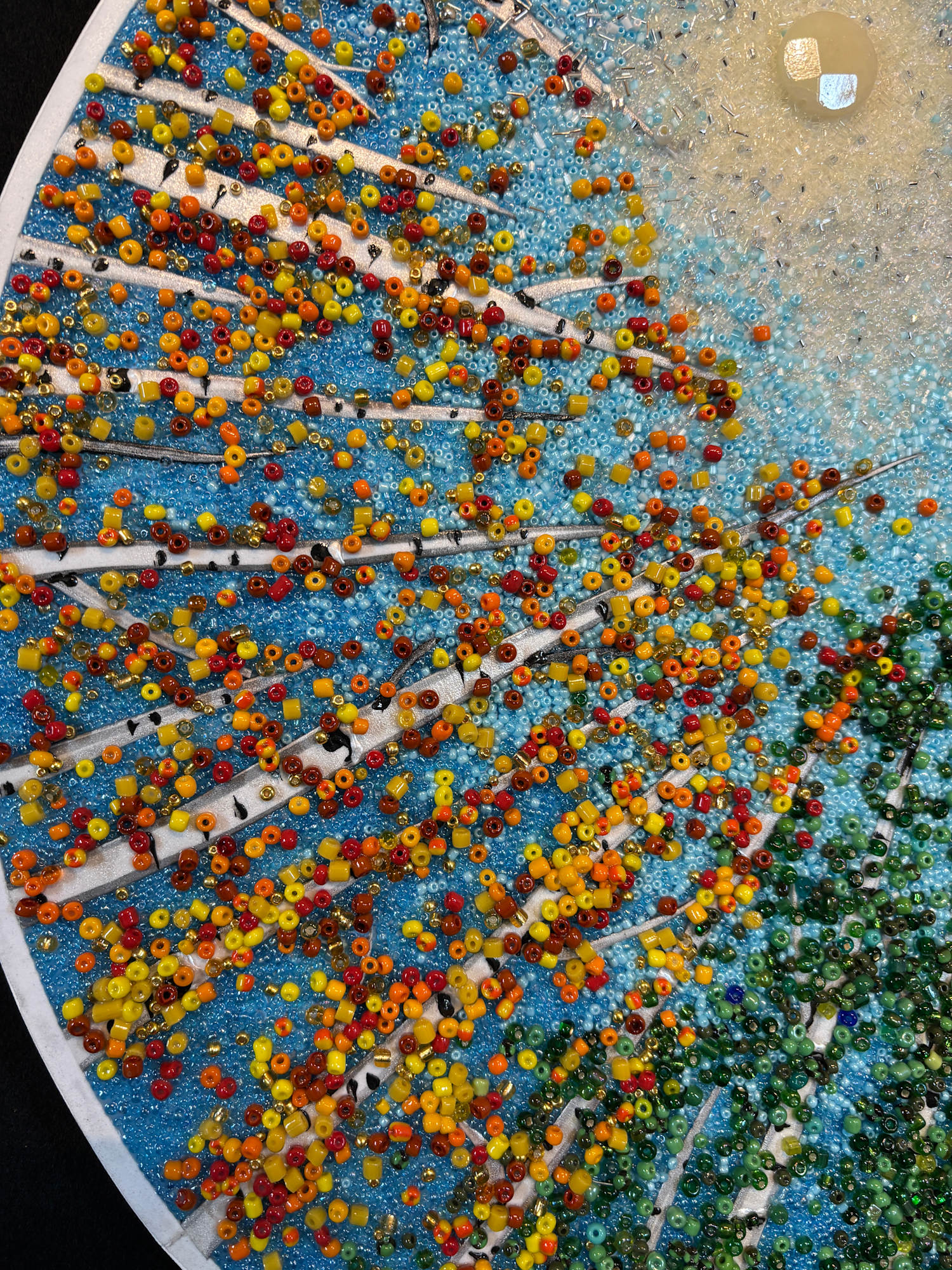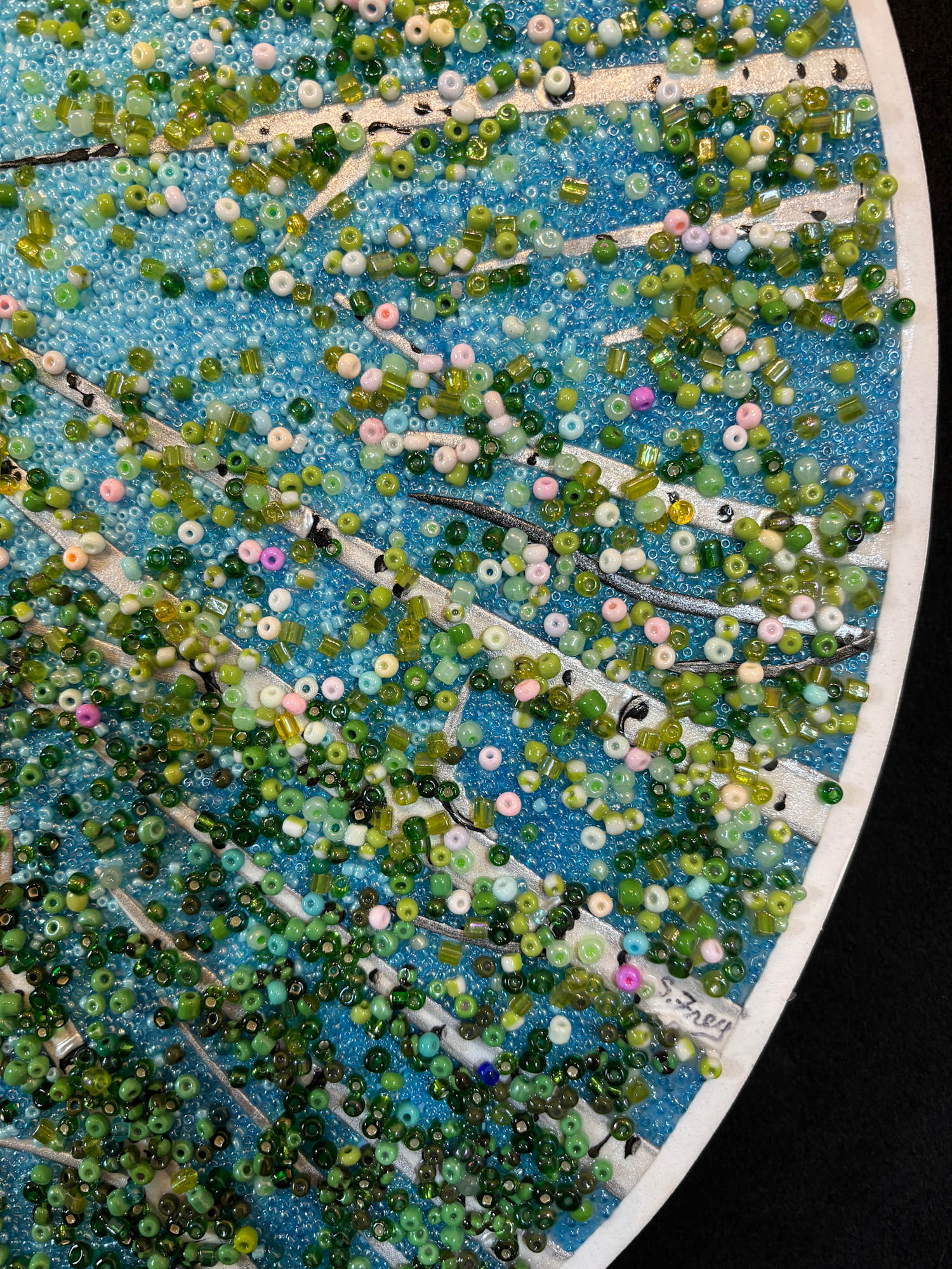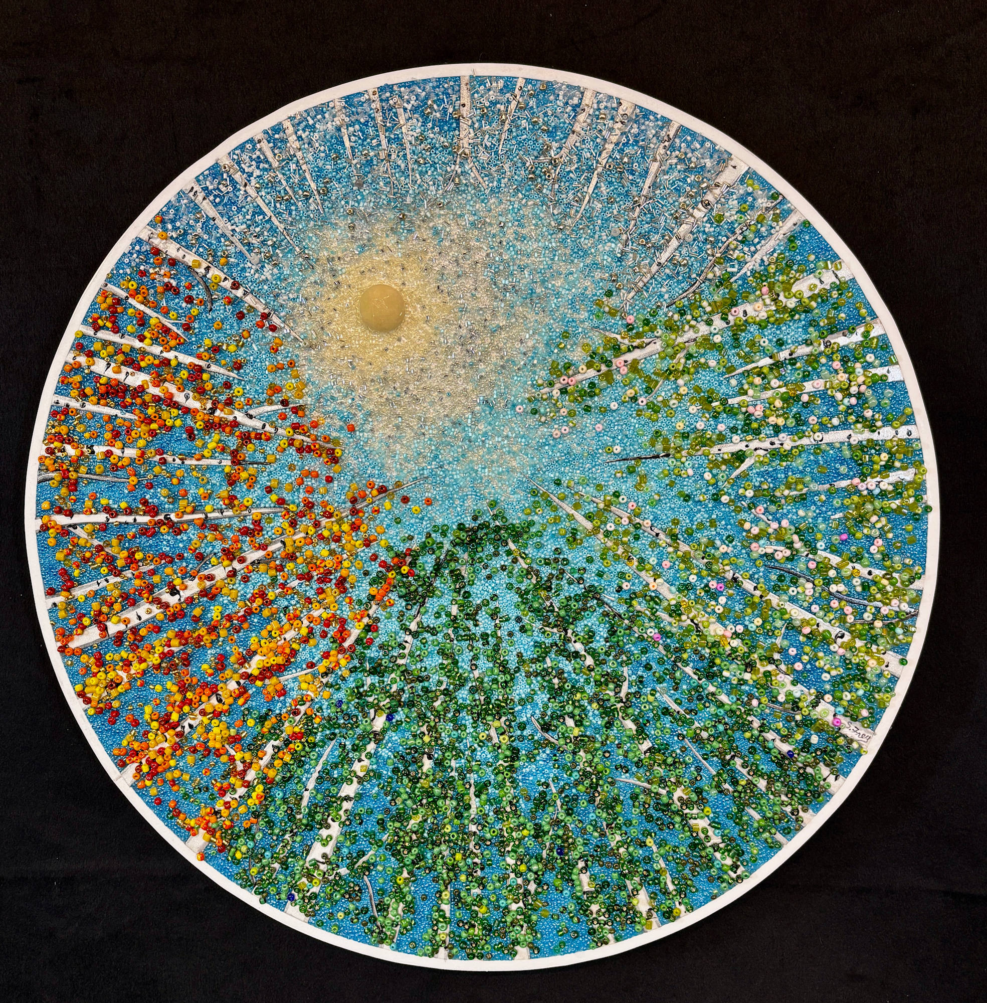 All Four Seasons from the hammock view looking up into the trees. The scene draws you in and up to the bright sun glowing in the sky above. Did you take a pause while hiking, just long enough to feel the trees rustle all around you. 20" Round with White Edges