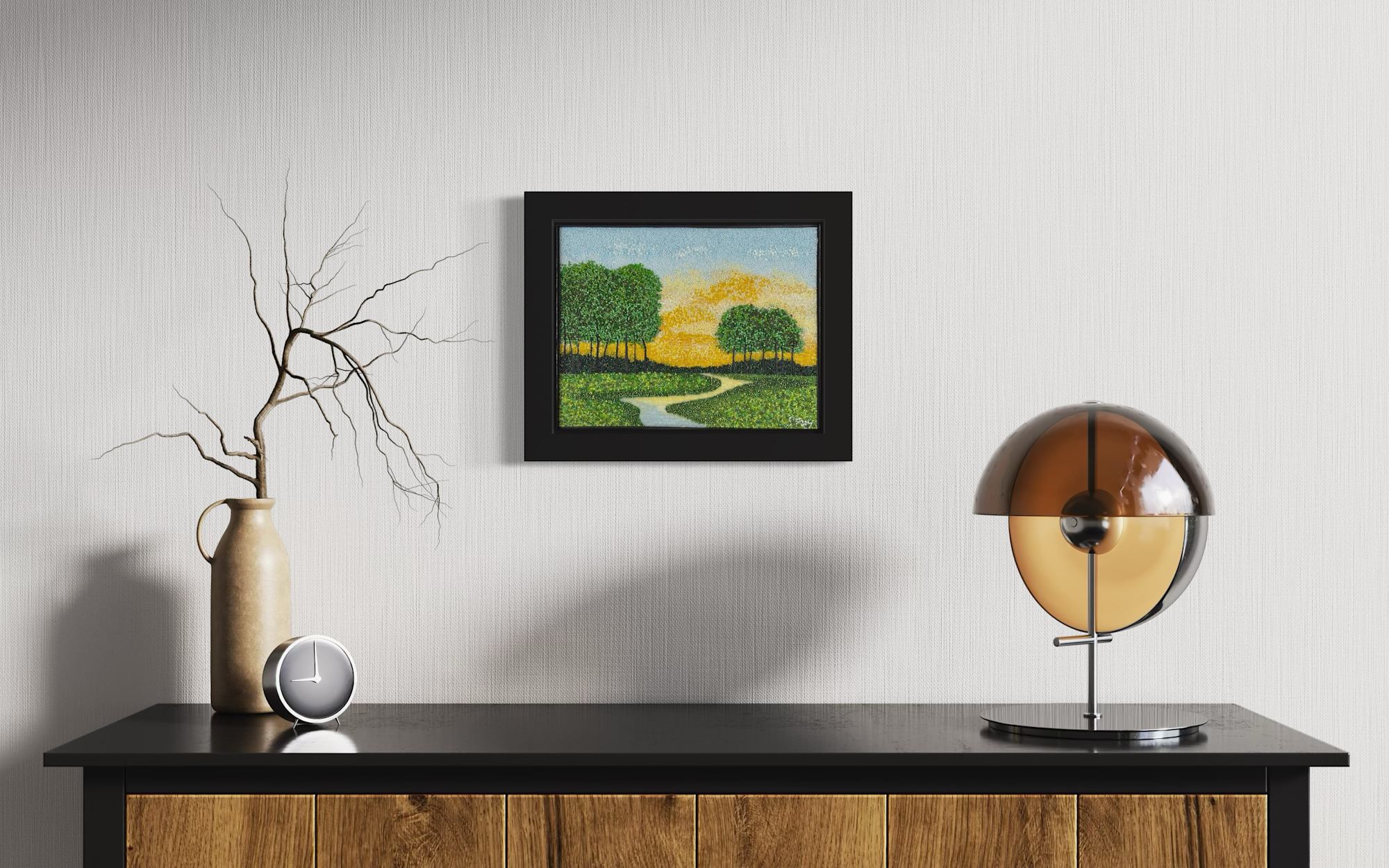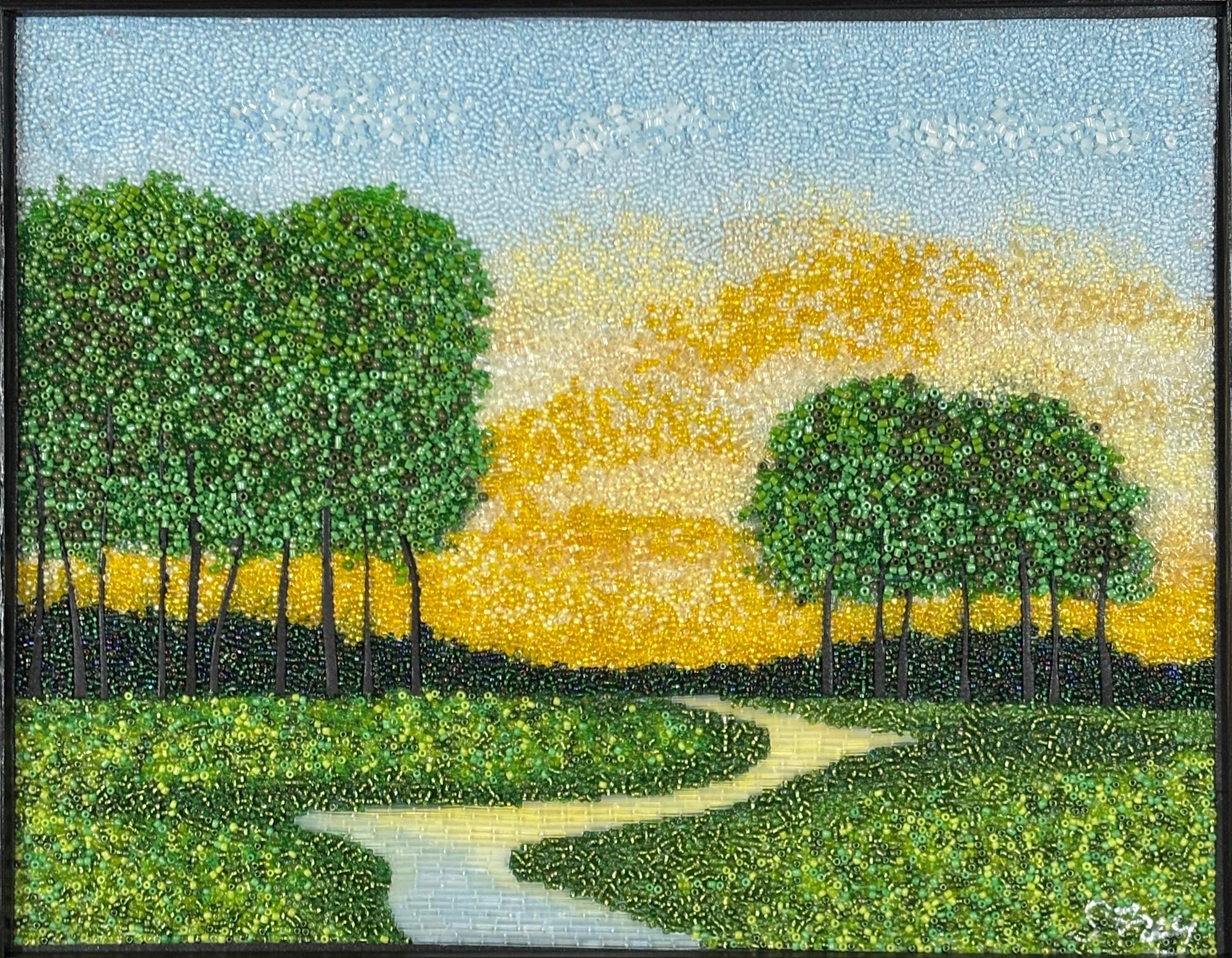 Soft Voices of Summer invites you into a serene, sunlit moment beside a gently flowing stream that winds through lush greenery. Crafted with meticulous beadwork, the scene captures the vibrant textures of dense foliage and tall trees standing in quiet harmony. Delicate clouds, add a tender softness to the atmosphere. This bead mosaic celebrates the quiet, uplifting beauty of nature’s rhythms and the gentle promise of summer’s embrace, offering a tactile and vivid experience that feels both intimate and expansive.