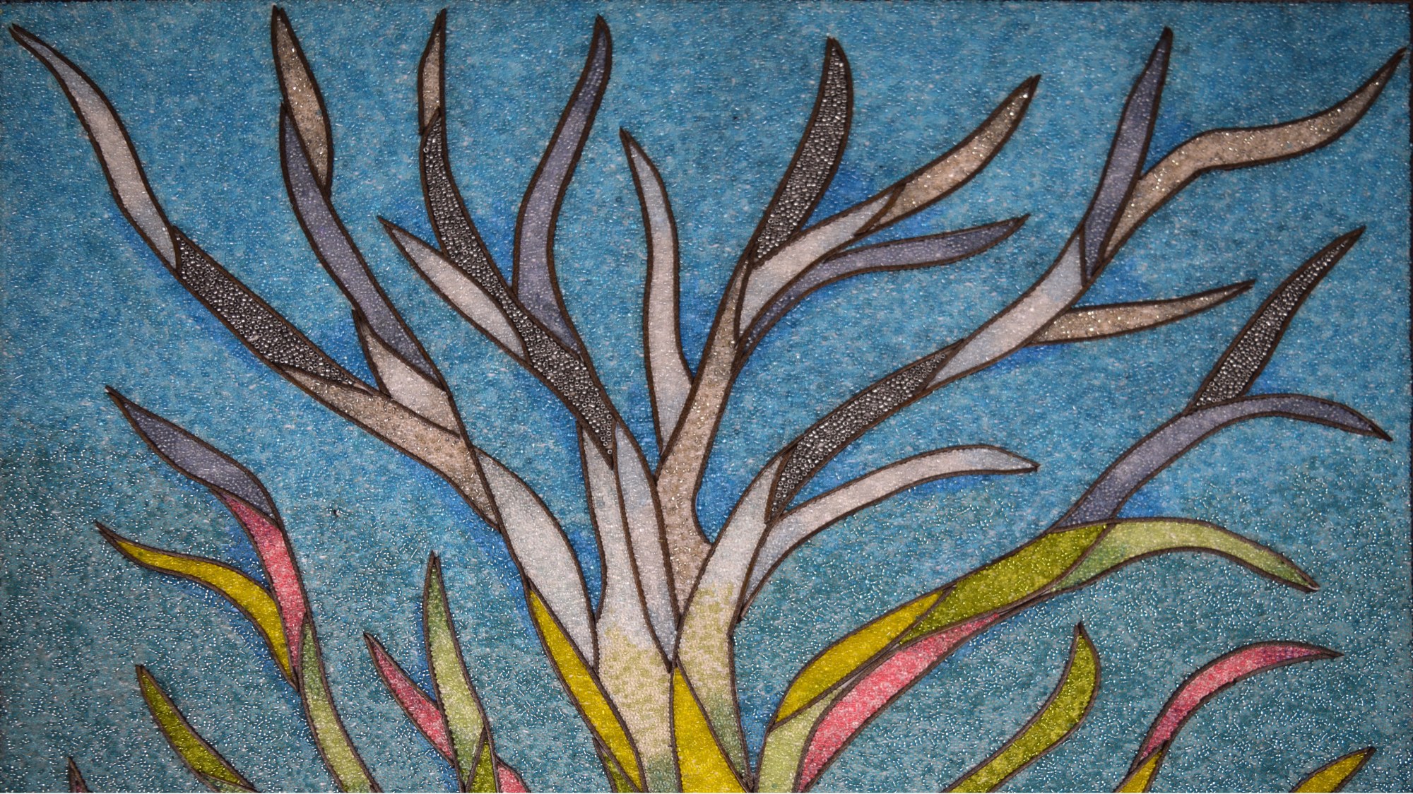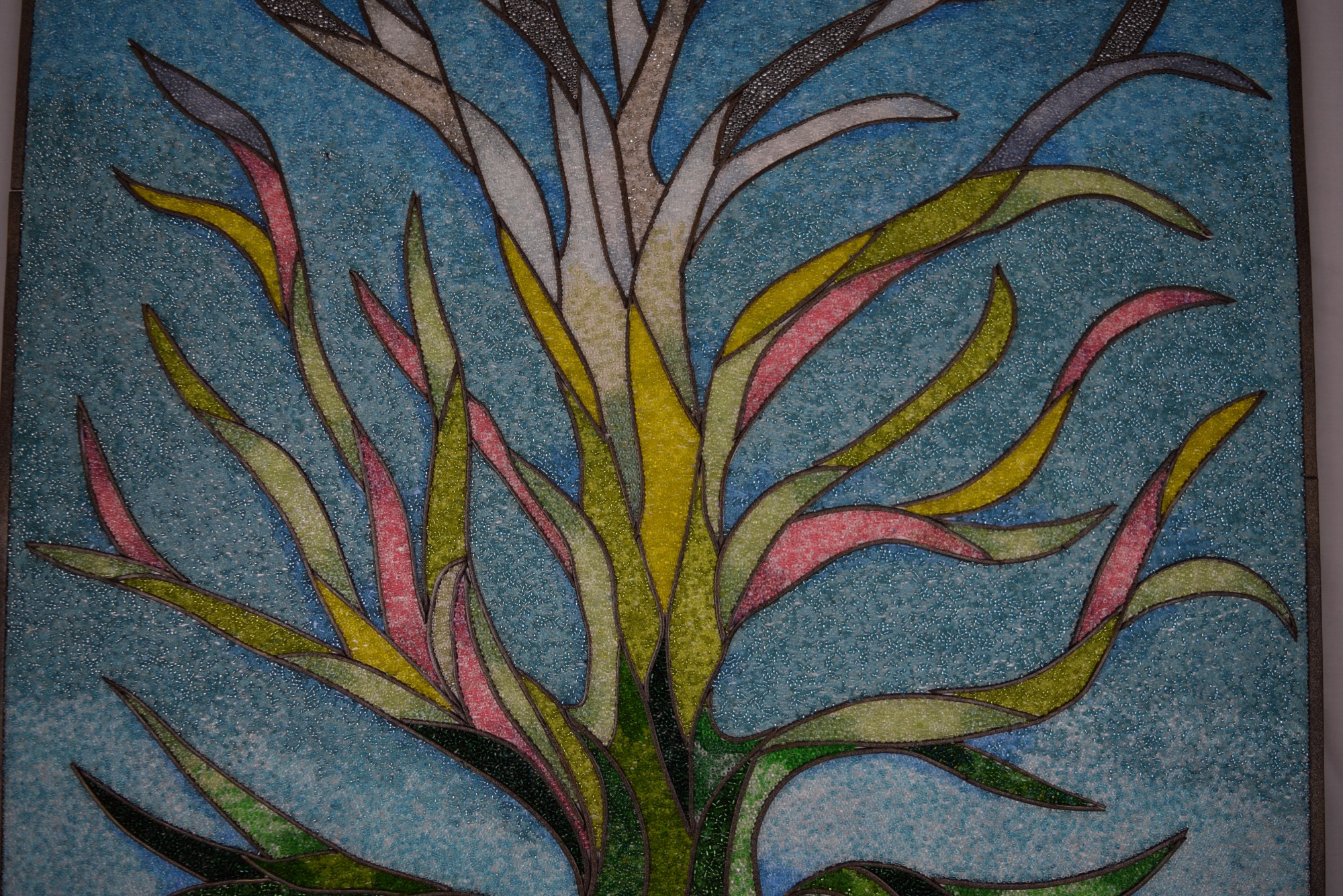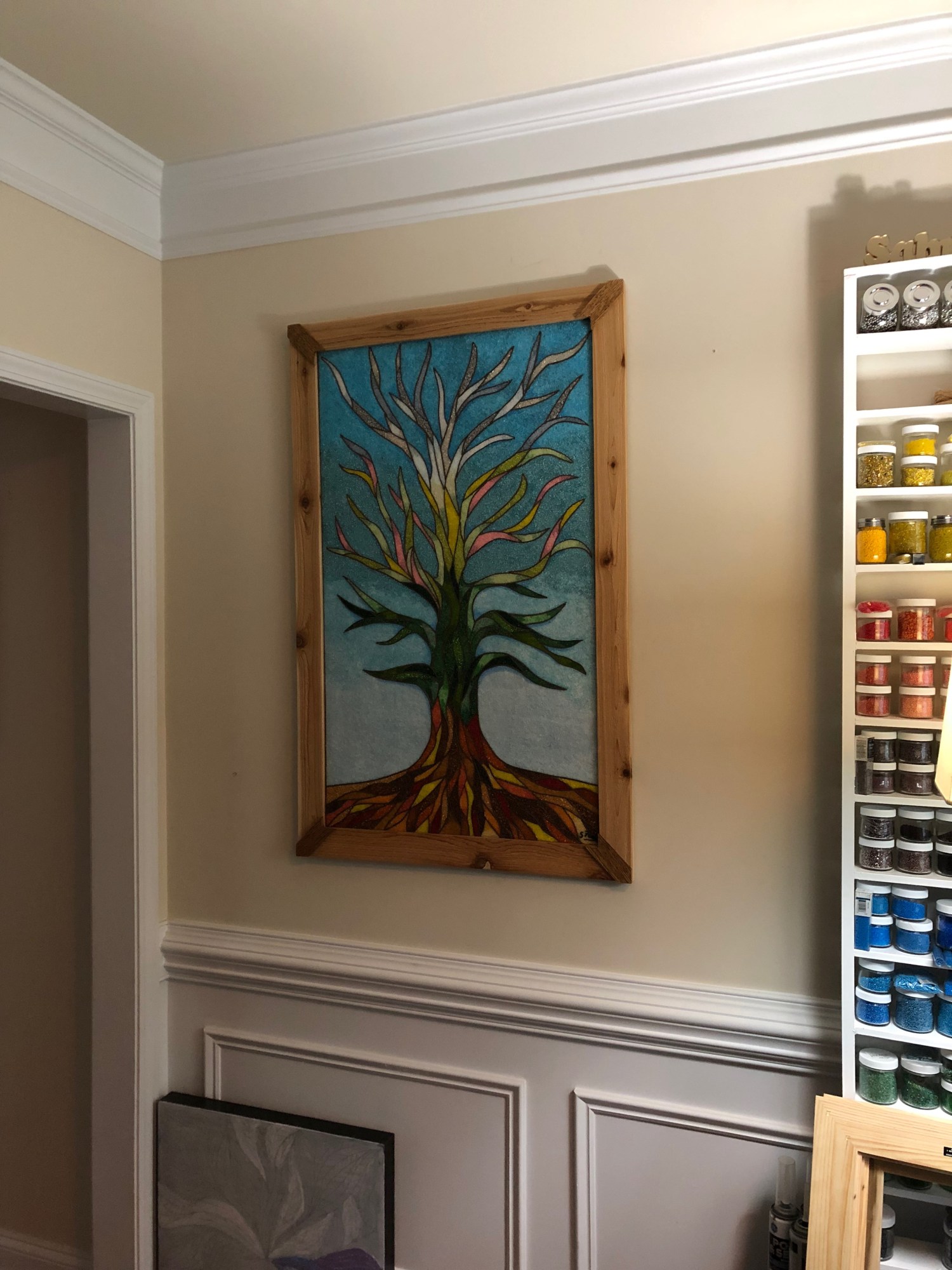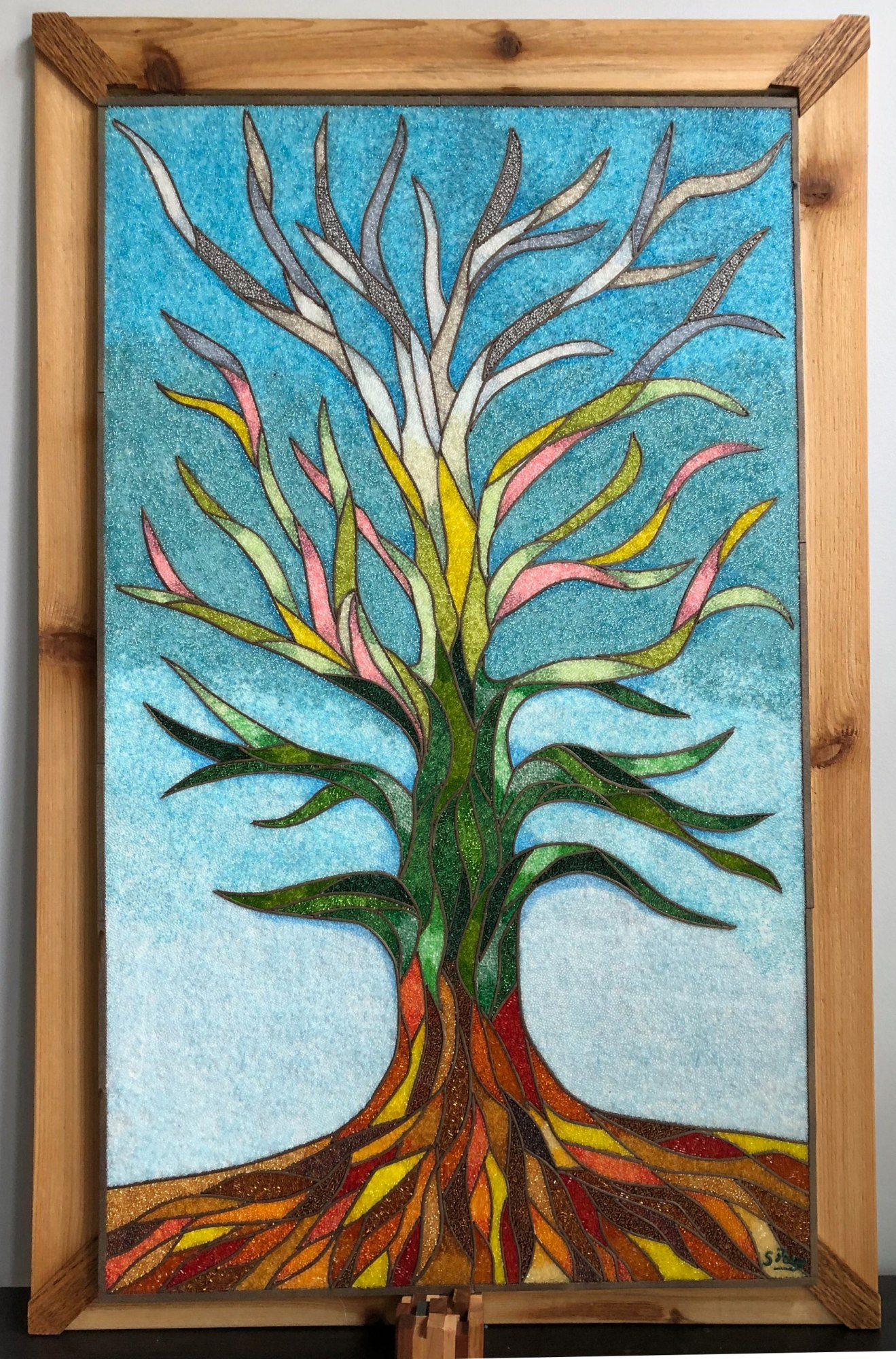 The seventh in the Tree of Life series. Here I decided to use more muted colors with the branches, highlighting the seasons and the background focusing on the blue of Skys surrounding the tree during those seasons. As with life some people choose to lead a more muted life with peace surrounding them. The entire piece shows extreme detail using 11/0 beads, contains approximately 245,000 beads and took over 50 hours to complete. It is framed in a natural wood frame.
