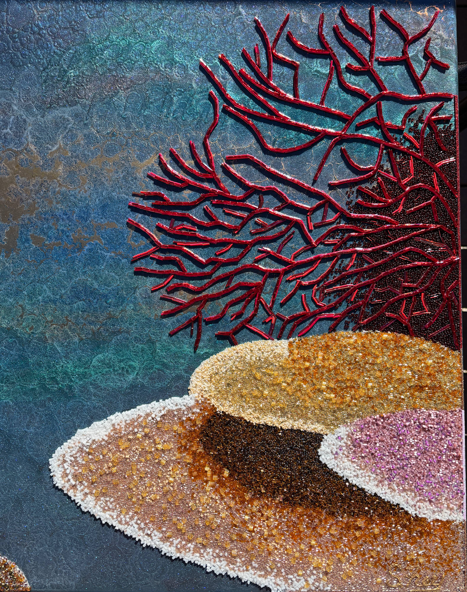 Third panel in set of three ocean theme set - the Coral reef with a turtle swimming through. "Underwater Rainforest" is an immersive mosaic that captures the vibrant life of an oceanic scene. At its heart is a turtle, dynamically depicted in motion, its shell and flippers intricately detailed with a rich interplay of colors and textures. Surrounding the turtle, a vibrant array of coral formations burst into life with hues of pink, purple, and yellow, each piece uniquely arranged to emphasize the dynamic aquatic environment. A solitary starfish adds a touch of whimsy as it rests amidst the corals. The background, a deep oceanic hue, creates a striking contrast that enhances the vividness of the depicted marine life. This artwork transforms an ordinary wall into a window to an enchanting underwater world, inviting viewers to marvel at the beauty and complexity of life beneath the waves.