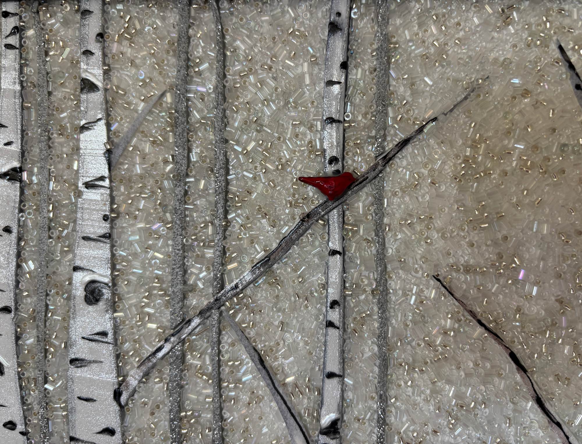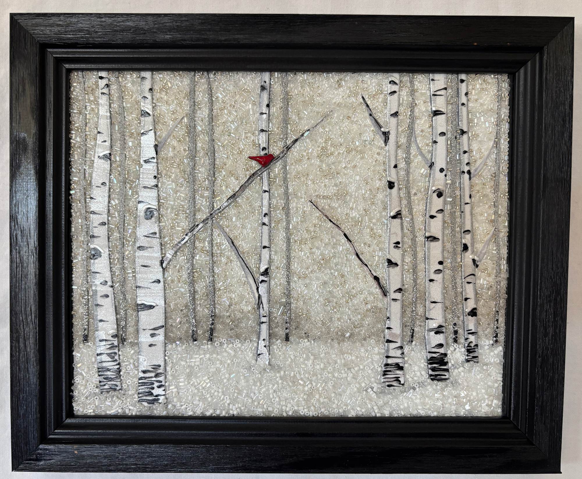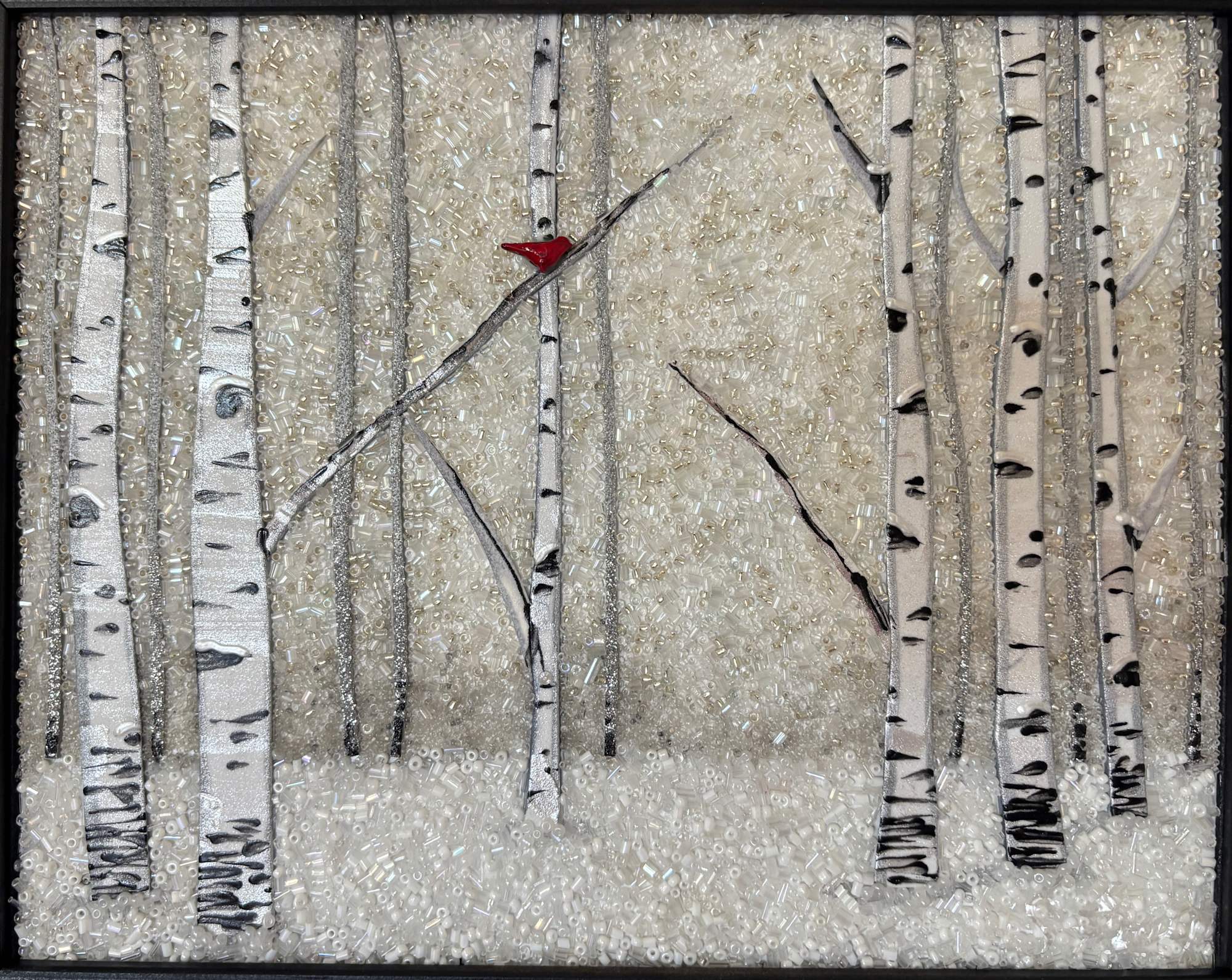 Winters Hope invites a moment of quiet reflection through a delicate interplay of texture and contrast. Crafted from glass beads, the piece captures the stillness of a winter forest where stark tree trunks and bare branches rise against a shimmering, frosted backdrop. The subtle sparkle of the beadwork evokes the chill of snow and mist, surrounding a solitary red cardinal whose vivid hue breaks through the subdued palette with hopeful warmth. This balance of simplicity and depth speaks to resilience and the promise of renewal even in the coldest seasons.