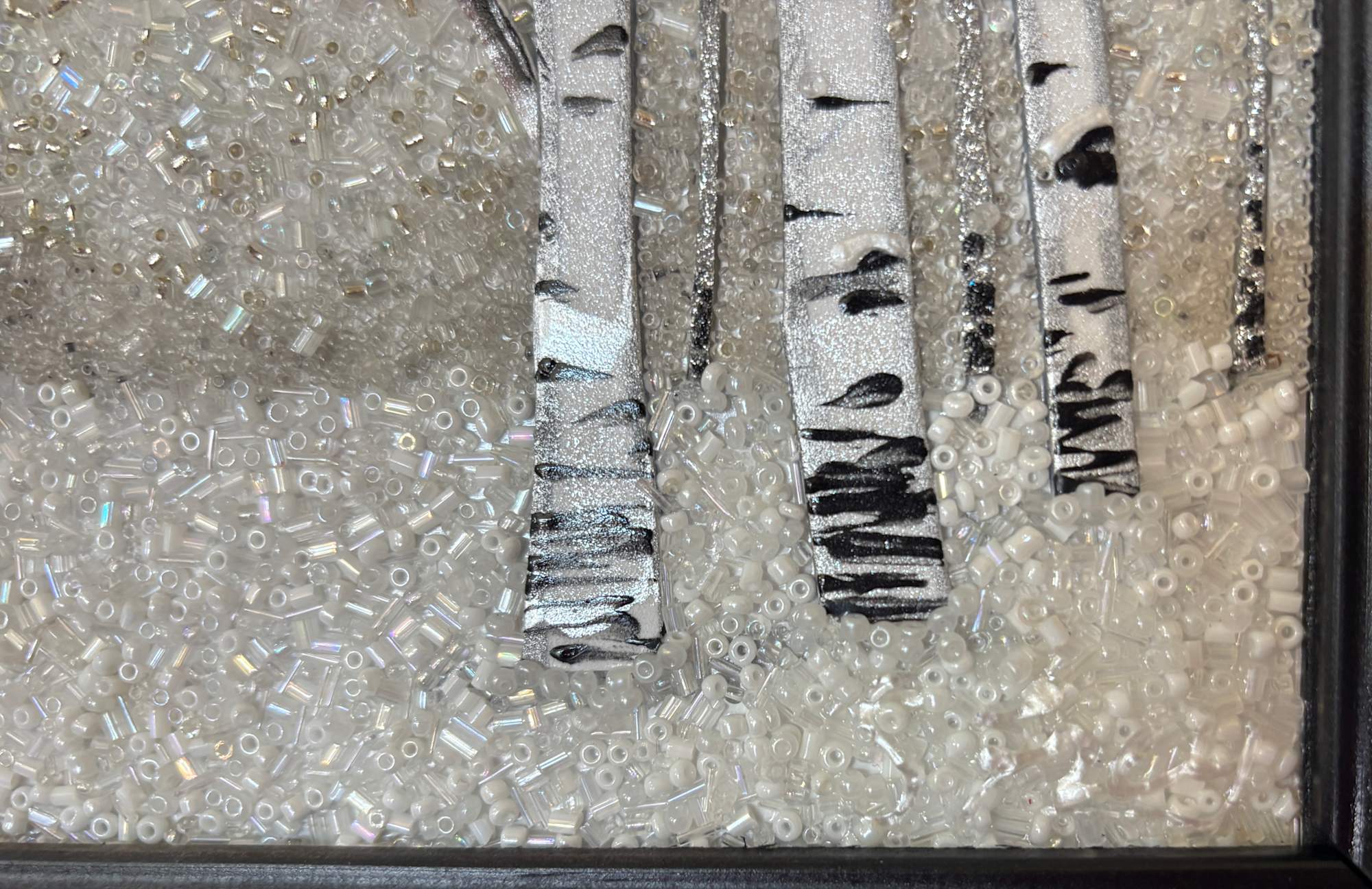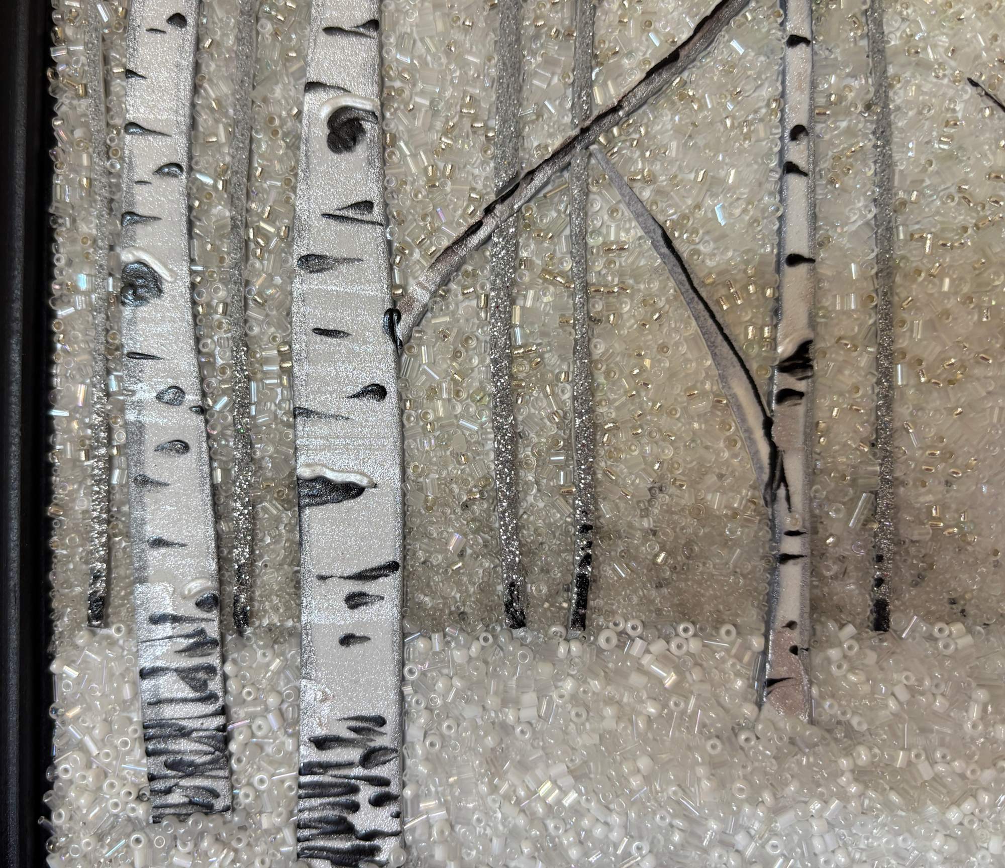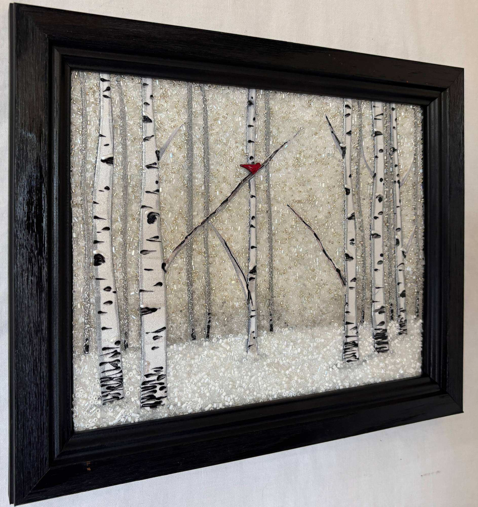 Winters Hope invites a moment of quiet reflection through a delicate interplay of texture and contrast. Crafted from glass beads, the piece captures the stillness of a winter forest where stark tree trunks and bare branches rise against a shimmering, frosted backdrop. The subtle sparkle of the beadwork evokes the chill of snow and mist, surrounding a solitary red cardinal whose vivid hue breaks through the subdued palette with hopeful warmth. This balance of simplicity and depth speaks to resilience and the promise of renewal even in the coldest seasons.