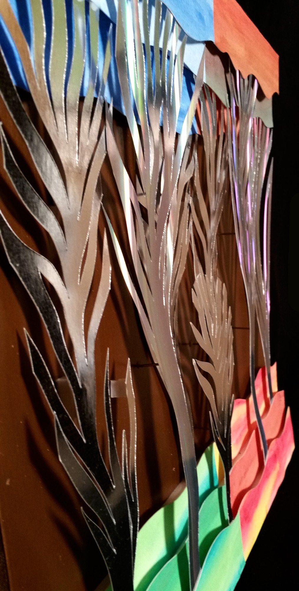 Fours season in water color with silver trees in hand cut paper, mounted in shadow box