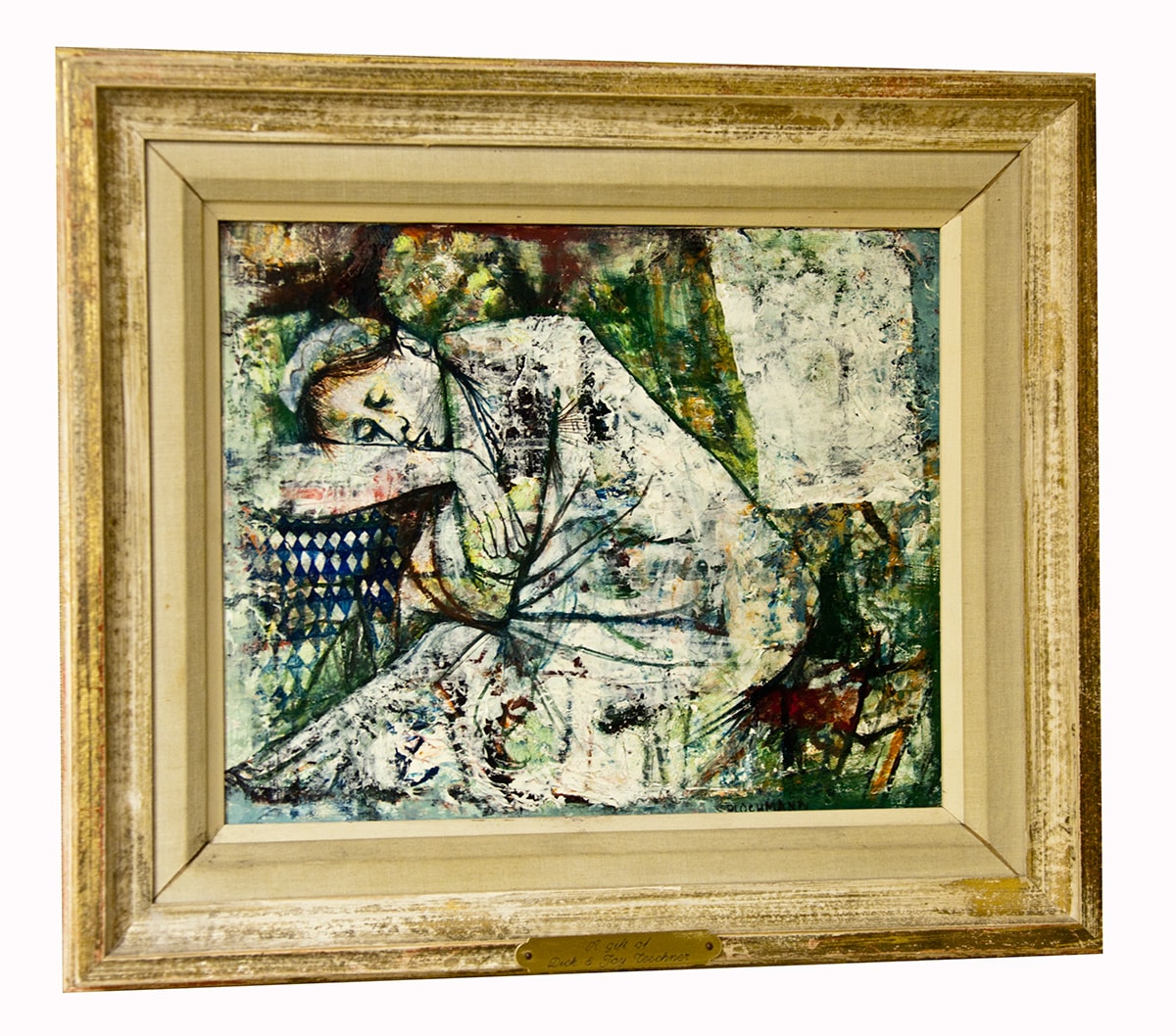 Sleeping figure with head resting on arm; blanket over shoulders; highly patterned background in muted tones of grey, green, and black. White painted liner in white and gold painted frame.
