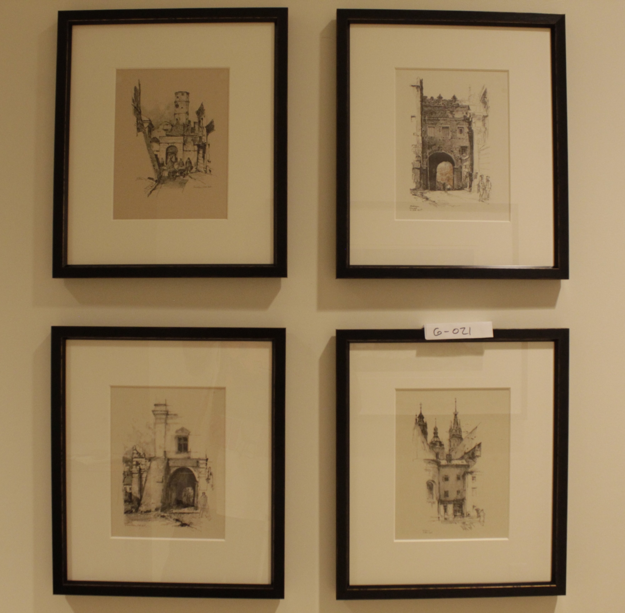Set of four Grand Tour prints. “Die verbrannte Klosterkaserne in Jaroslau”, “Krakau, Eingang zum Wawel”, “Jaroslau, Das alte Stadthaus”, “Krakau, Turme der Marienkirche”