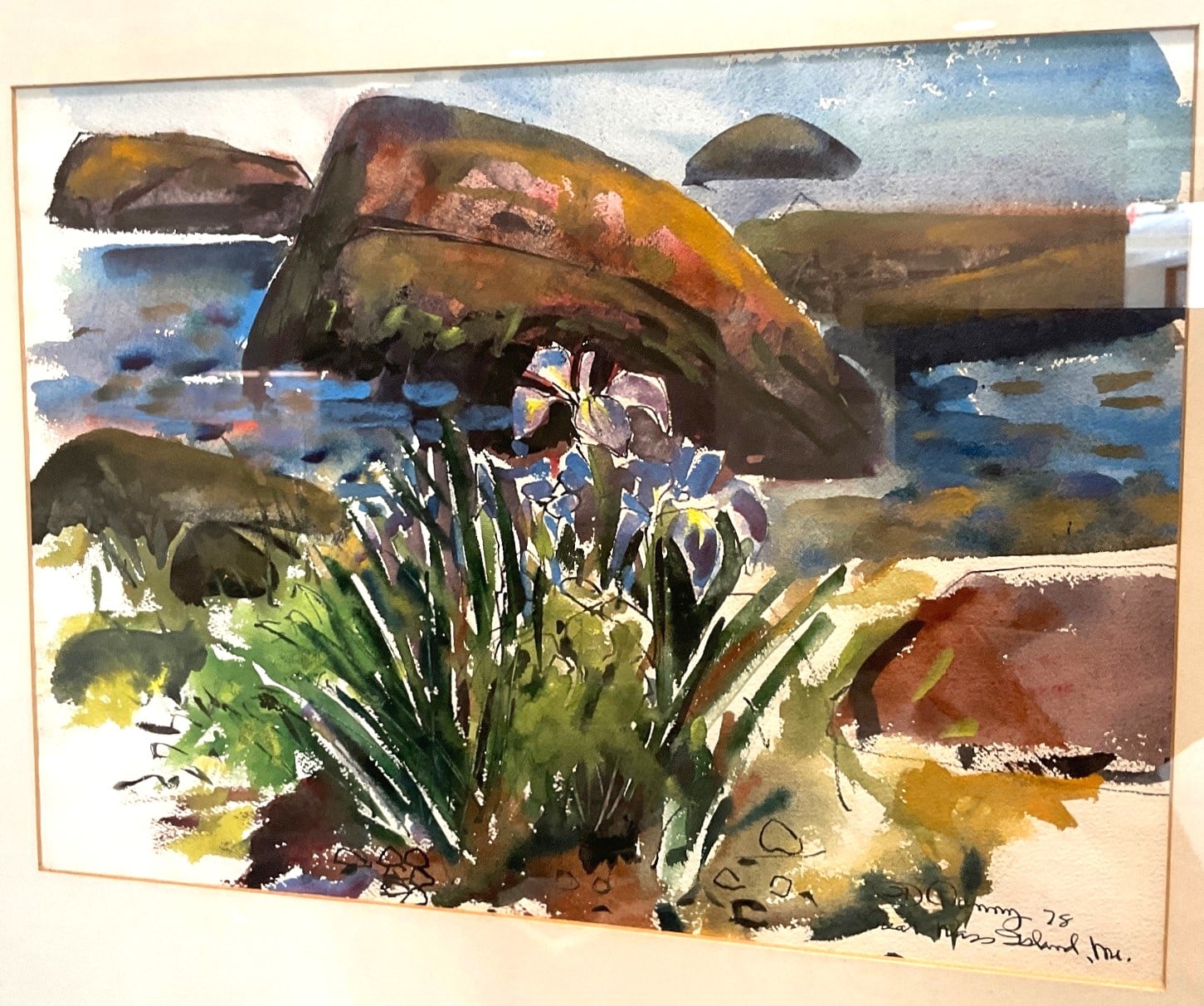 Coastal scene with rocky hills in the foreground and misty water in the background.