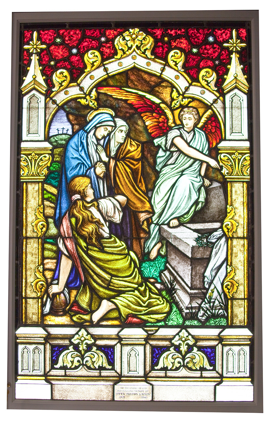 Scene of Jesus' empty tomb; Angel announcing He is risen; women standing nearby