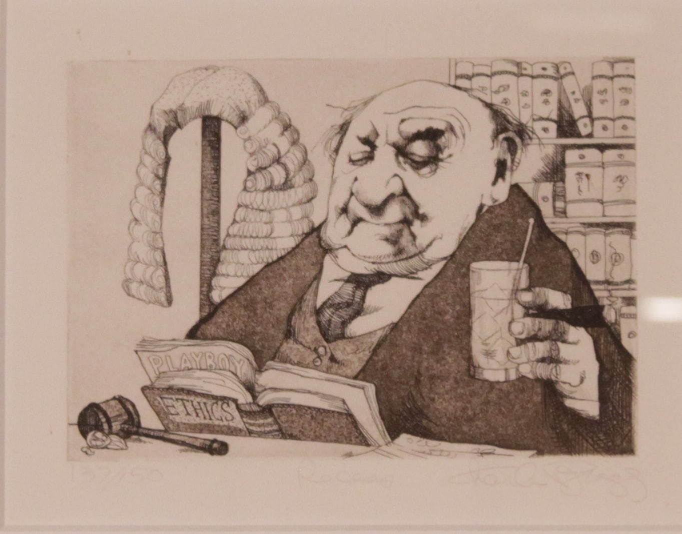 Judge sits reading Playboy with cigar and drink; ed. 137/150.