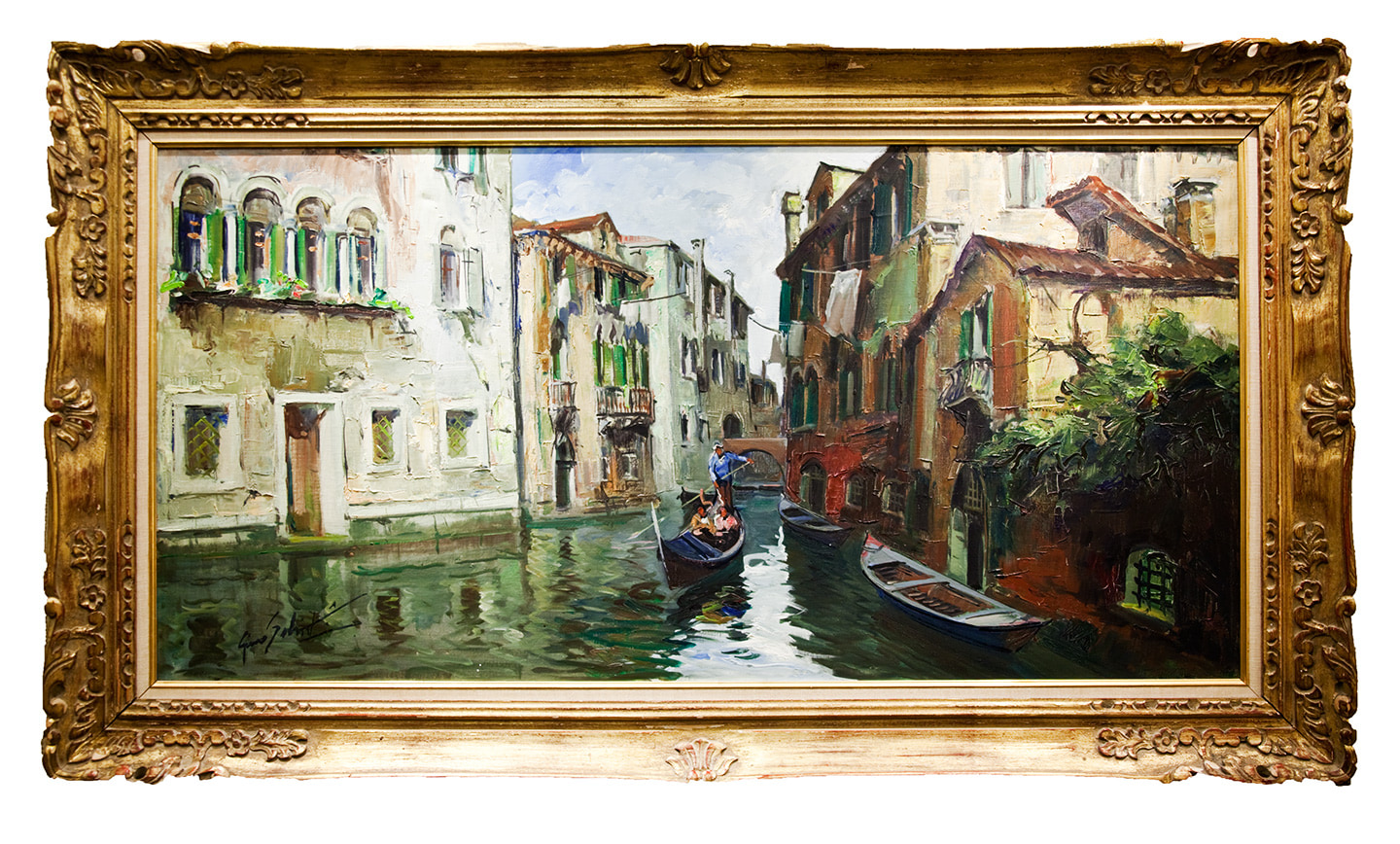 Gondola on canal in Venice, fast impressionistic painting on canvas with areas of heavy impasto. Green canal water flanked by stone buildings; a gondolier navigates the canal with 2 passengers. Ornate gold frame.