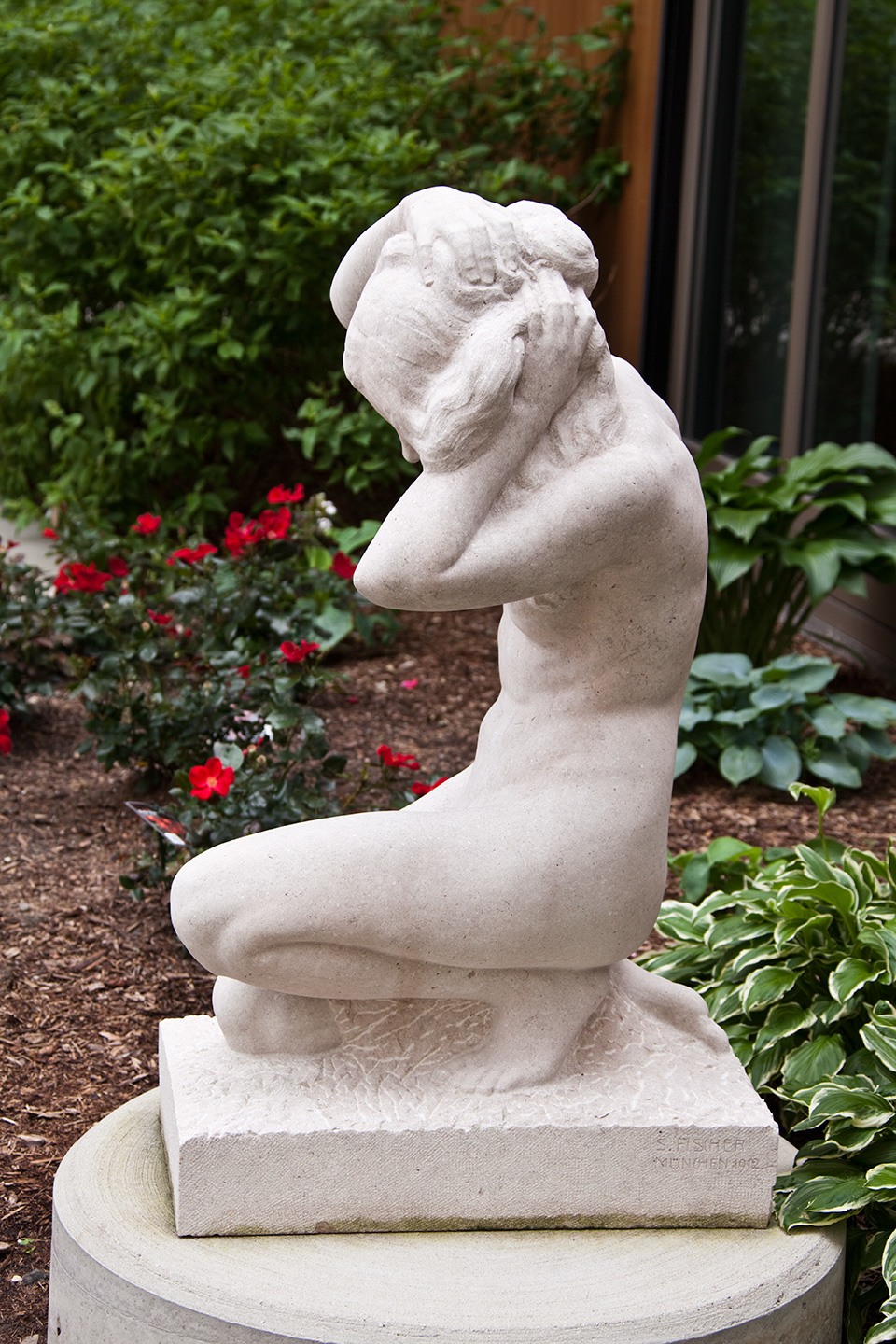 Kneeling nude woman in carved stone; arms raised with her hands holding long hair.