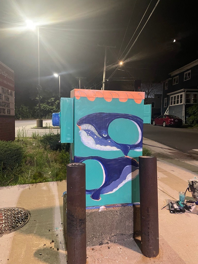 Artist Statement: Paying homage to this area of Salem once called Blubber Hollow, North Atlantic Right Whales float by with large hollowed-out bodies now occupied by man-made objects, like a lighthouse and a shipwreck.