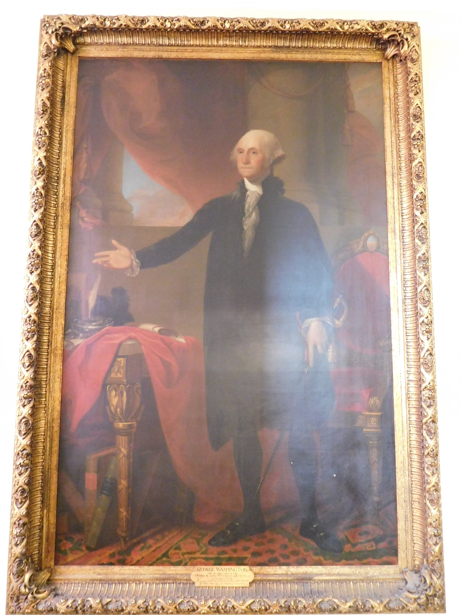 Full-length portrait of George Washington (1731-1799) standing in an elegant room with his arm stretched out, hovering above his desk. This painting is a copy of Gilbert Stuart’s (1755-1828) 1796 original.