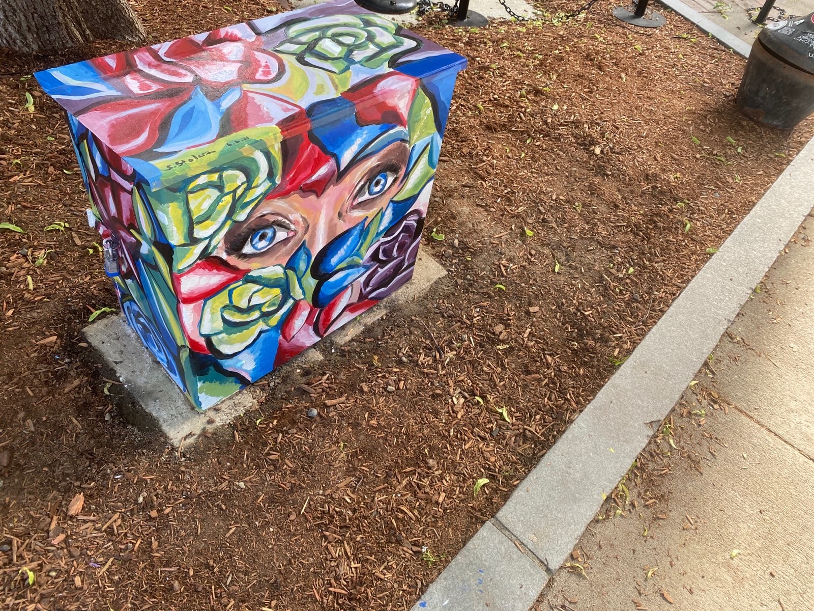Some real pretty eyes hiding in a bush of rainbow flowers. Painted on lighting and signal control box.