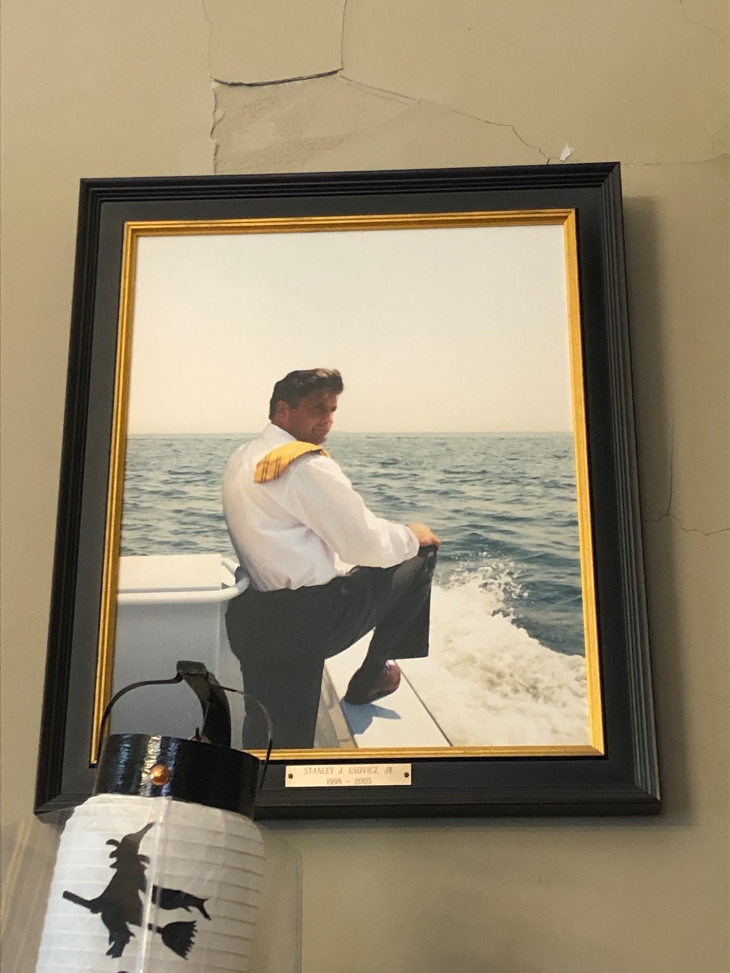 Photograph of Stanley J. Usovicz, Jr., Mayor of Salem, 1998-2005. Usovicz poses on his boat with one leg up, looking back over his shoulder. His yellow tie has been swept over his shoulder.