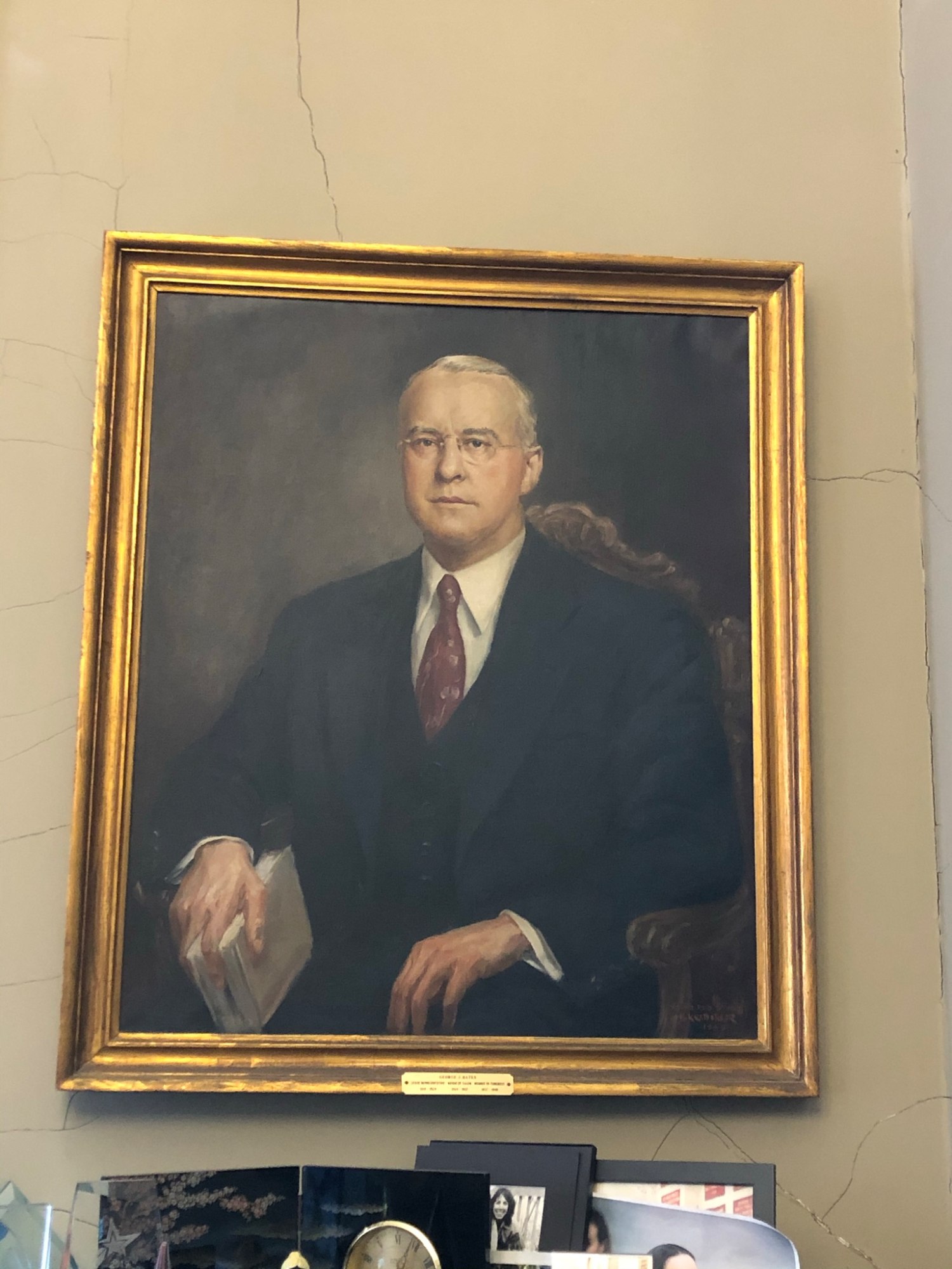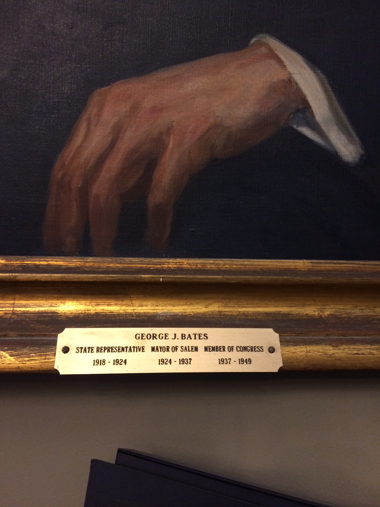 Half-length portrait of George J. Bates (1891-1949), Mayor of Salem, 1924-1937, State Representative, 1918-1924, and Member of Congress, 1937-1949. Bates wears a black suit, red tie, and glasses. He sits in an armchair with a book in one hand. This painting is based on a photograph taken by Roland Reid Studio.