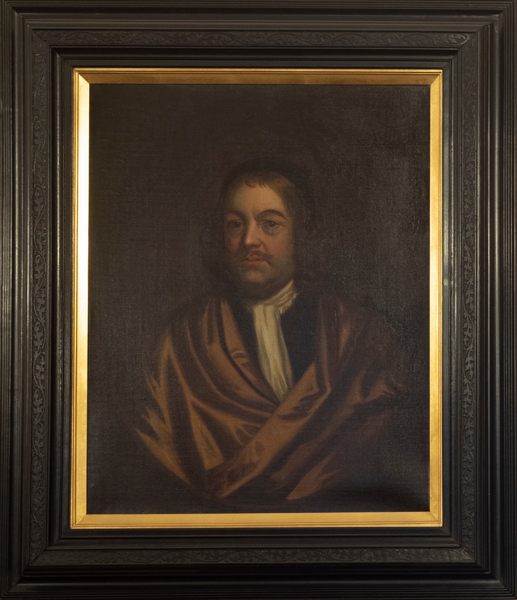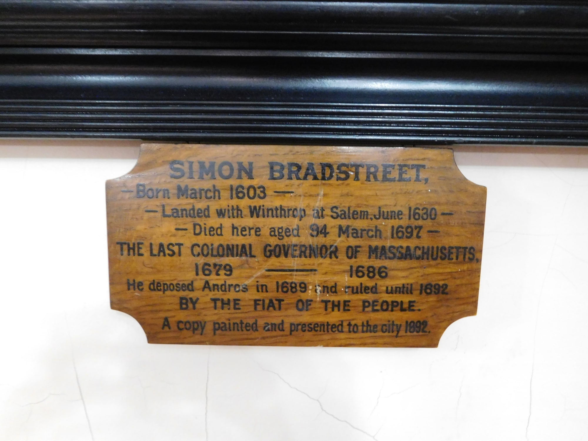 Half-length portrait of Governor Simon Bradstreet (1603-1697). Bradstreet is in satin robes, a black cap and a white scarf. This is a copy of the original hanging in the Senate Chamber of the Massachusetts State House.