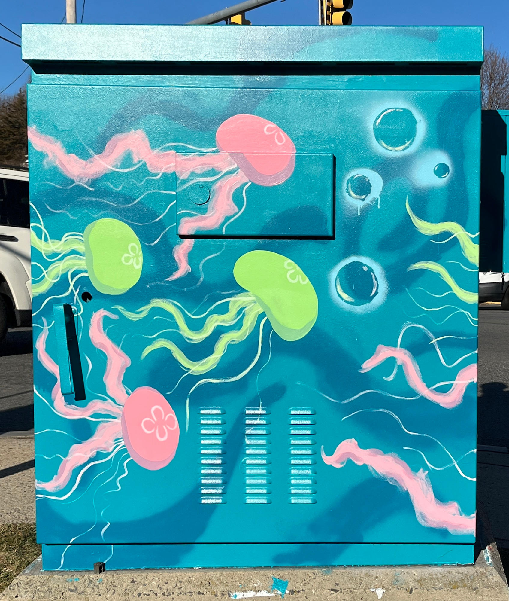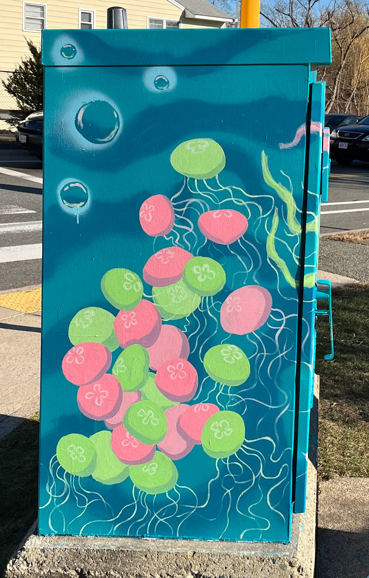 Artist Statement: Saturation is sunshine. Our jellyfish mural is painted as bright as we could make it, in an effort to light up the street corner. We leaned into a cartoon-ish style, with hard shadows that make the creatures POP! We wanted this project to have a fun process and a fun result- especially being near 3 Salem schools, and such a highly-trafficked intersection, we hope that as people walk, bike, or drive by, their commute will be lit up with our eye catching design, and bring some good vibes to their day.