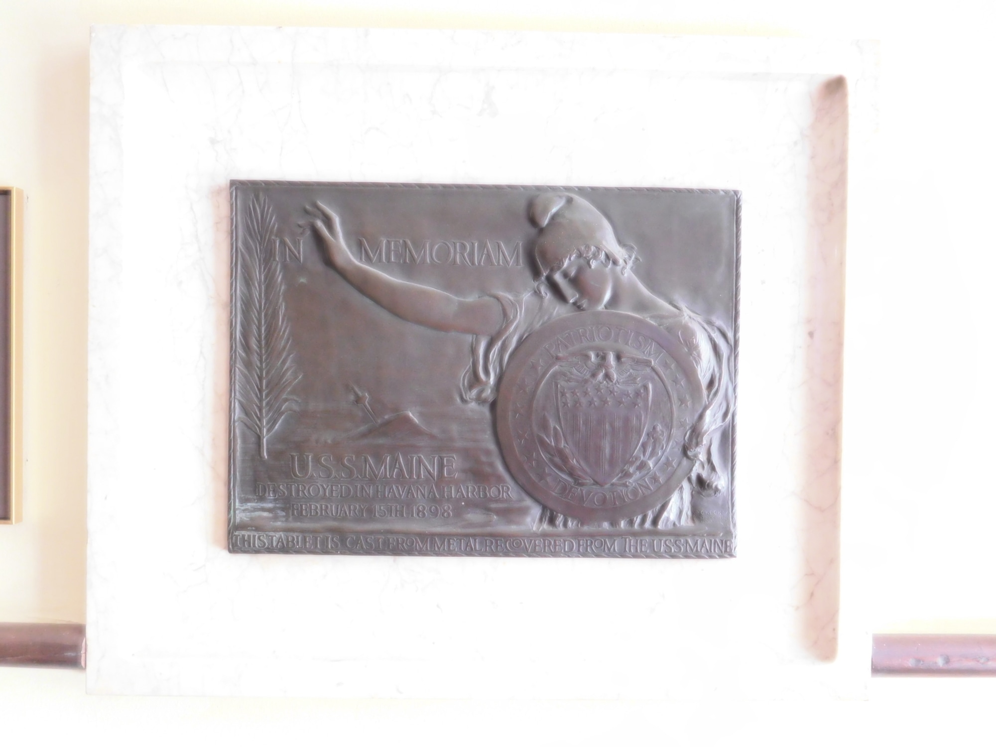 Memorial plaque depicting a soldier and part of the U.S.S. Maine.
