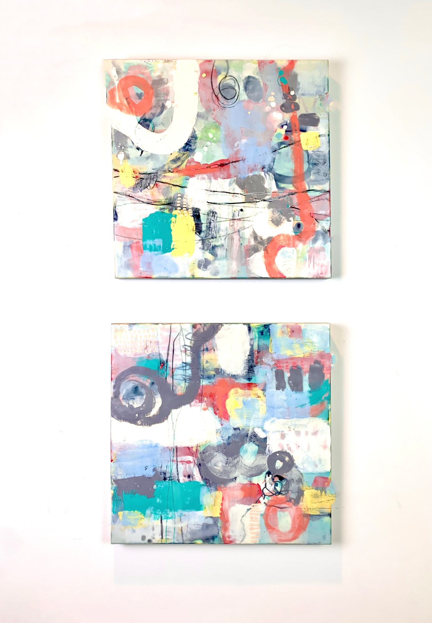 Encaustic Diptych, each piece is 18" square by 2" deep