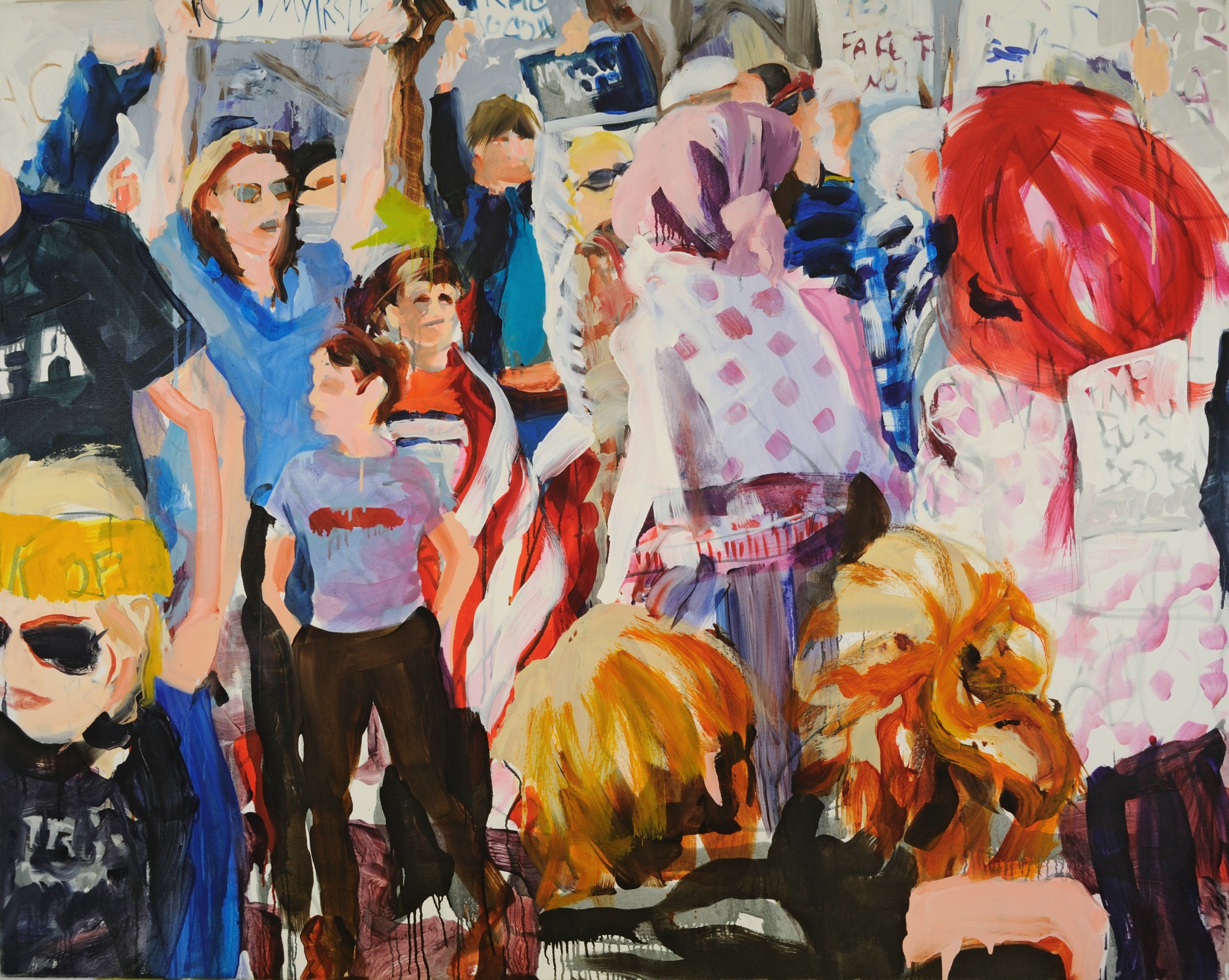 Sally Kauffman, based in Washington, DC, is recognized for her large-scale abstract paintings that depict people and animals engaged in social settings.