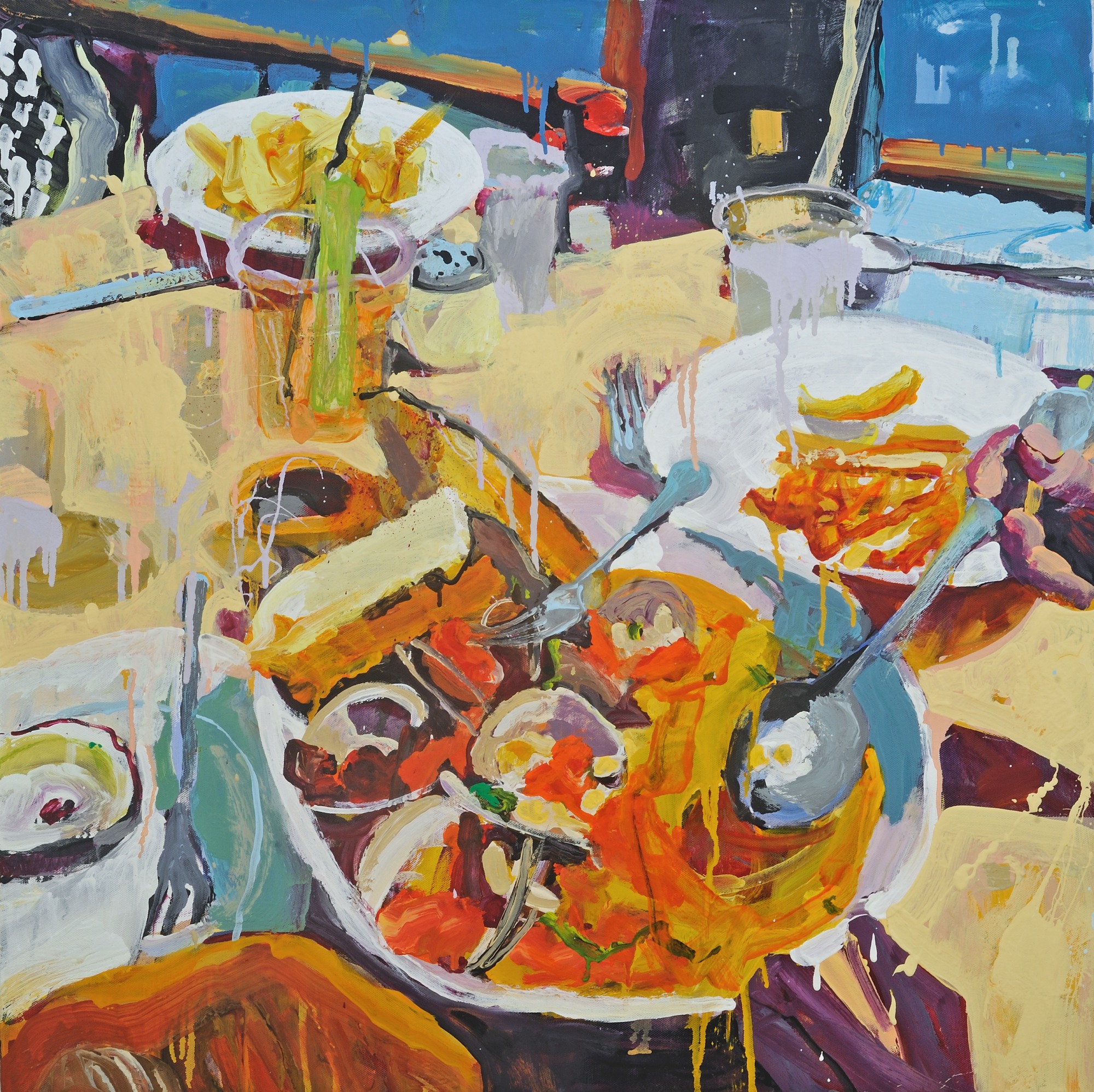 Sally Kauffman, based in Washington, DC, is recognized for her large-scale abstract paintings that depict people and animals engaged in social settings.