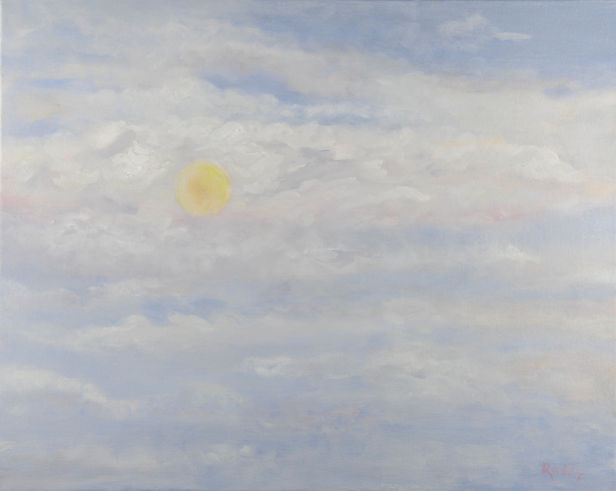 daytime moon in cloudy sky, blues, lavenders, pinks, creams