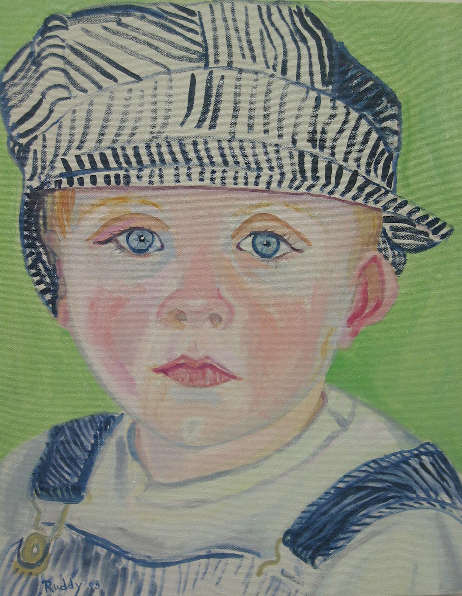 Artist’s grandson on 3rd birthday in train conductors overalls and hat