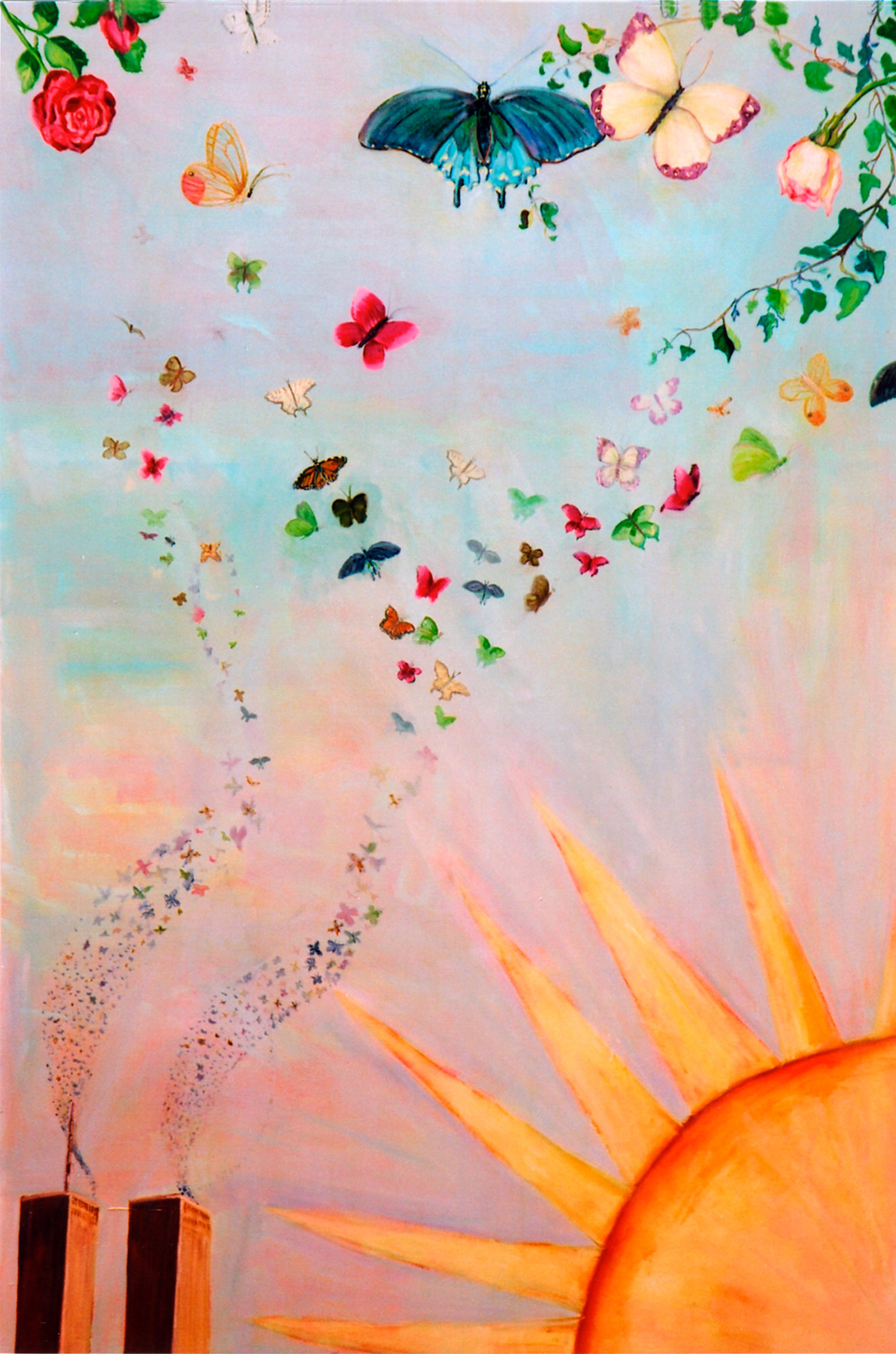 World Trade Center Towers (09/11/2001), shining sun, Butterflies emerging from the tower roofs