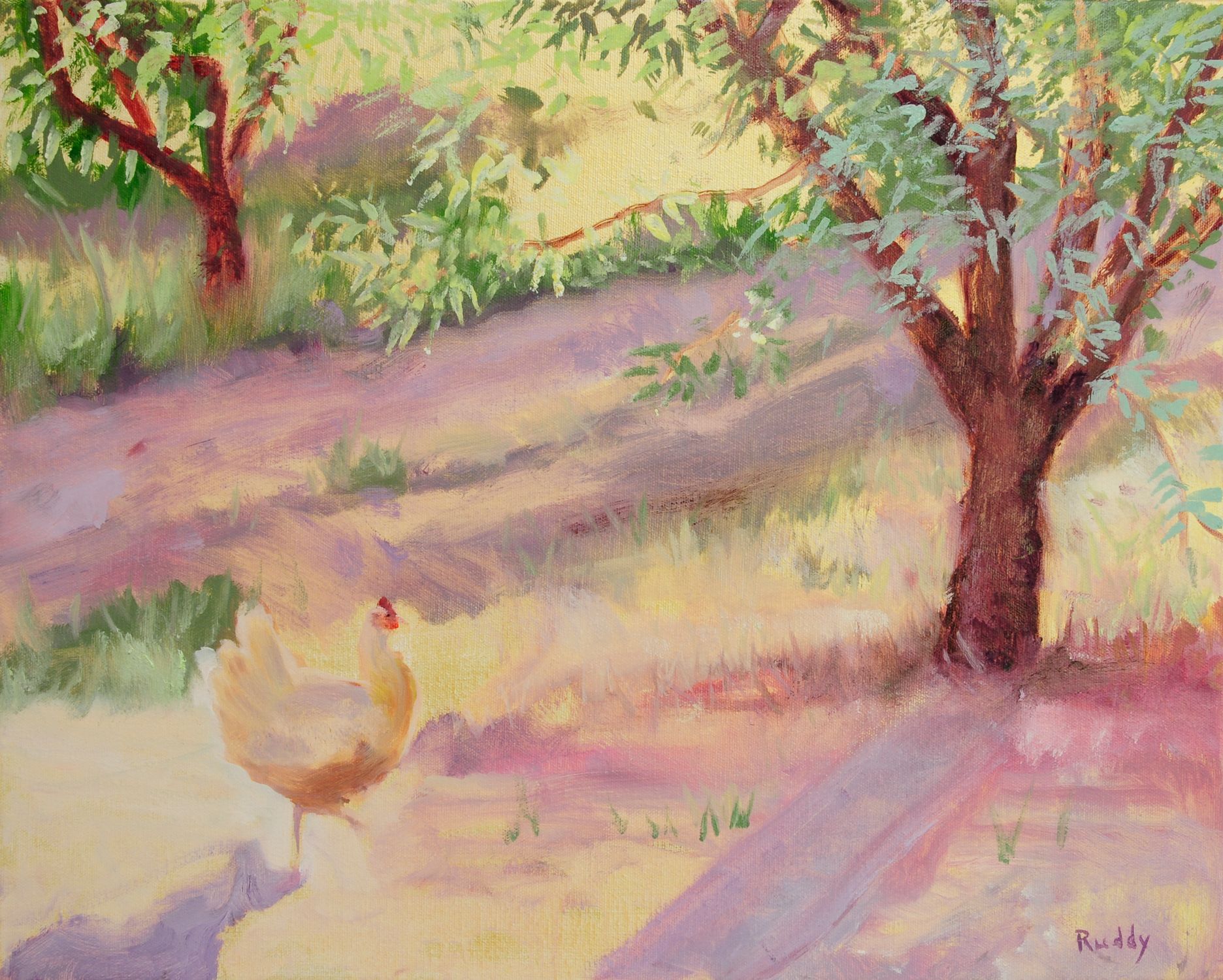 yellow chicken scratching in almond orchard