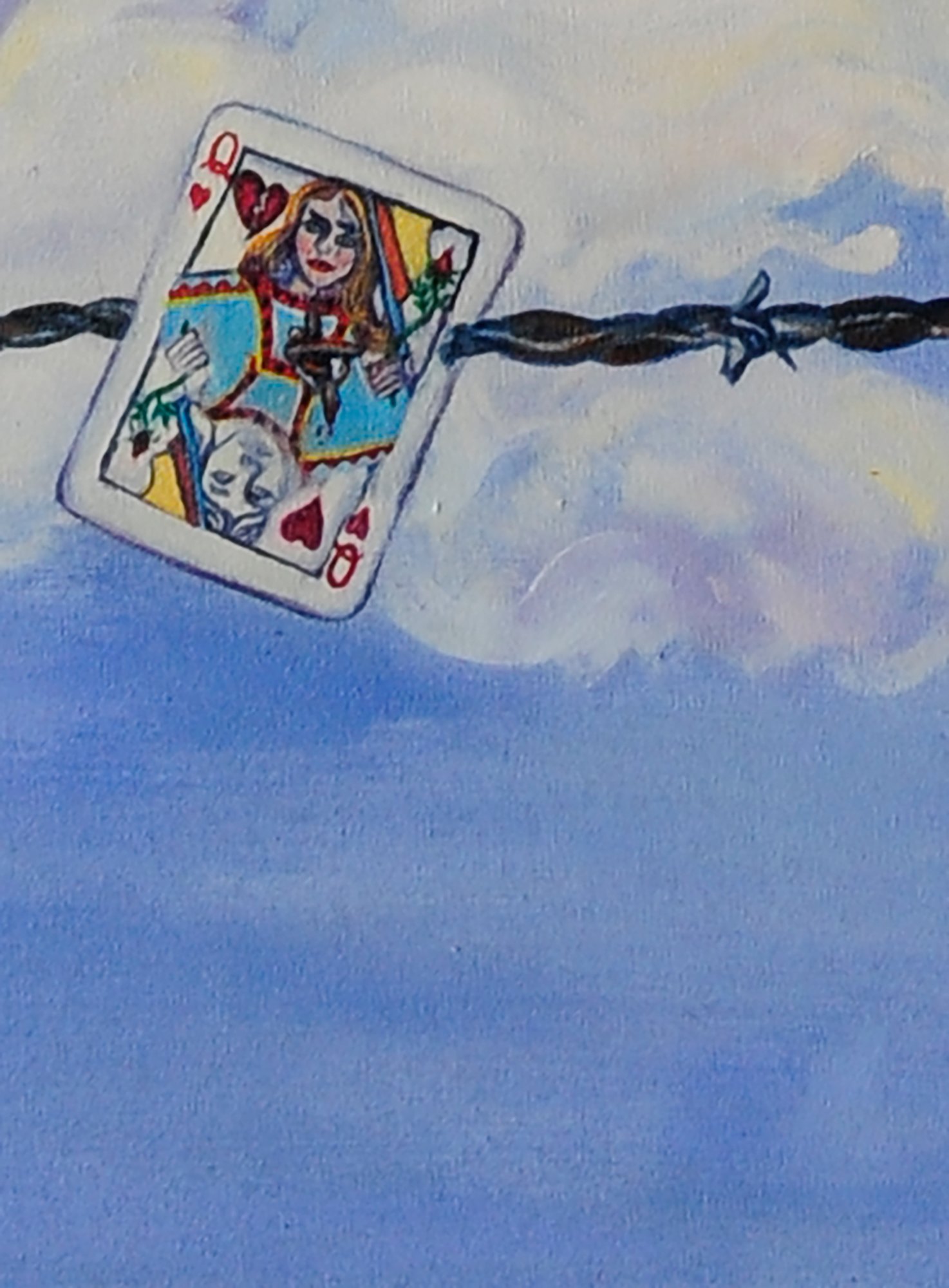 Wooden cross, barbed wire fence with Queen of Hearts Playing card caught on second row of the fence