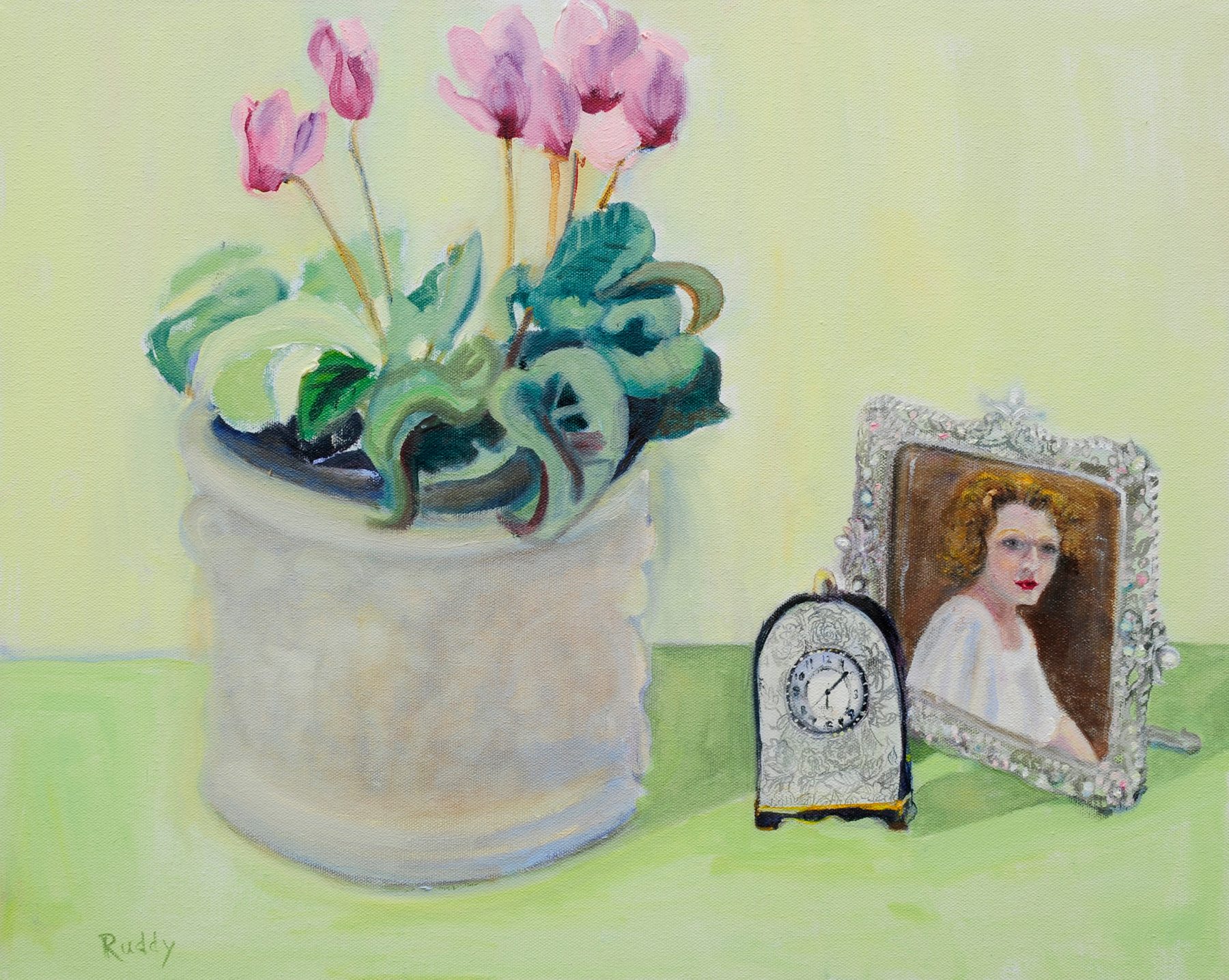 still life including a potted cyclamen photo of artist and small porcelain clock