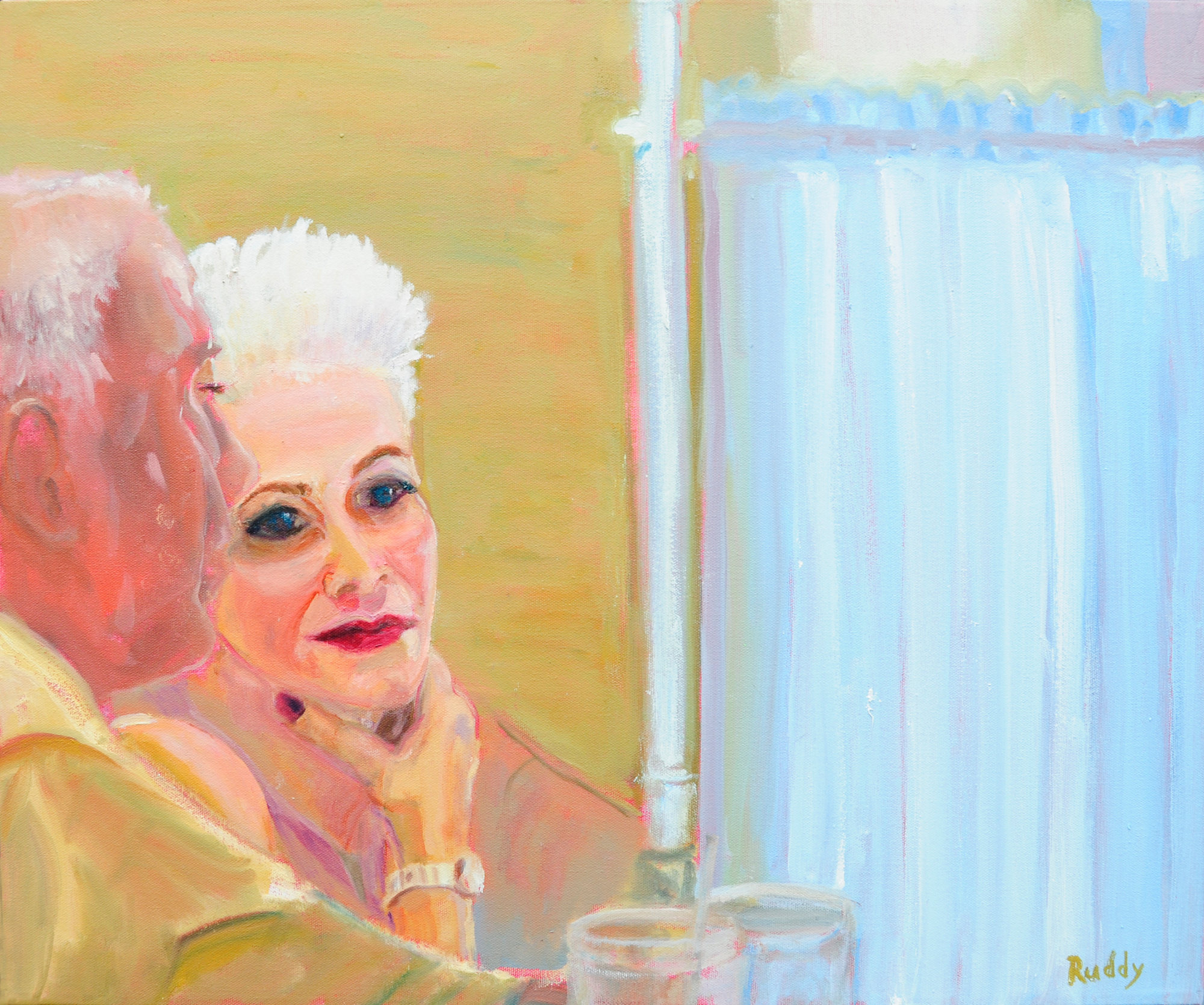 older couple, focus on woman in Talulah’s Restaurant in Sonora CA