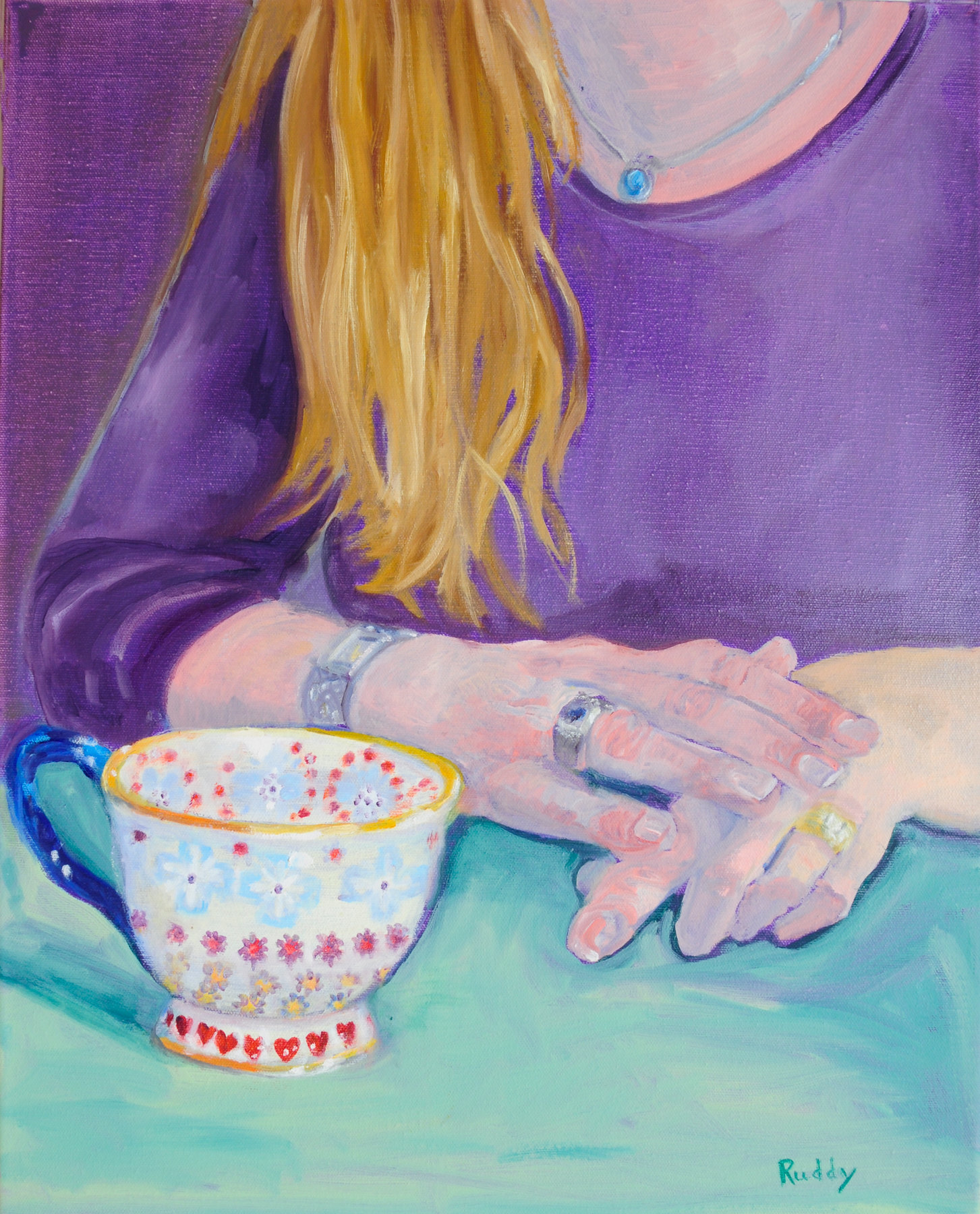 blonde haired woman in purple shirt, rings, watch and necklace by pottery cup