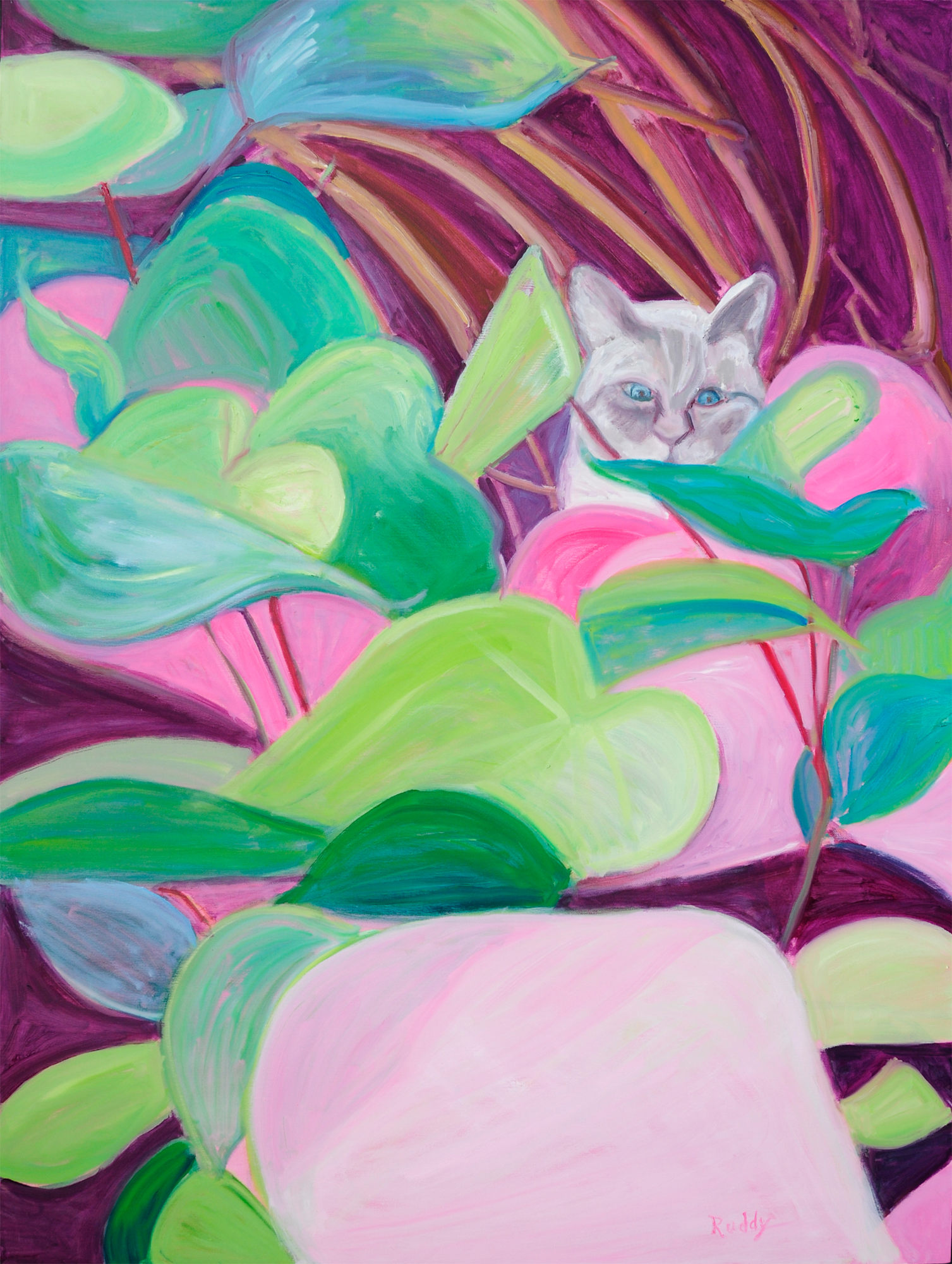 white and silver cat with blue eyes in green and pink foliage