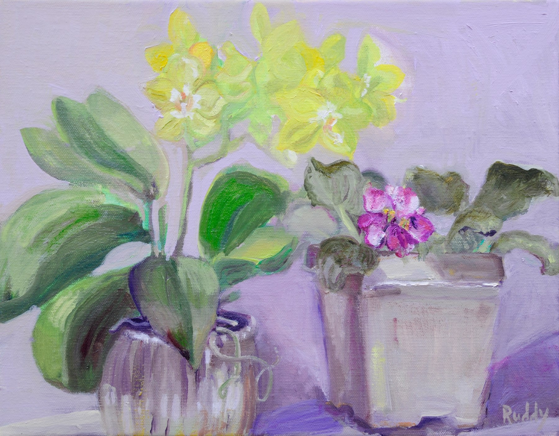 yellow orchid, purple and white african violet in silver pots on lavender background