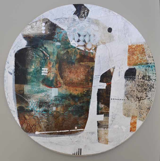 A mixed media piece on a round panel original price £325